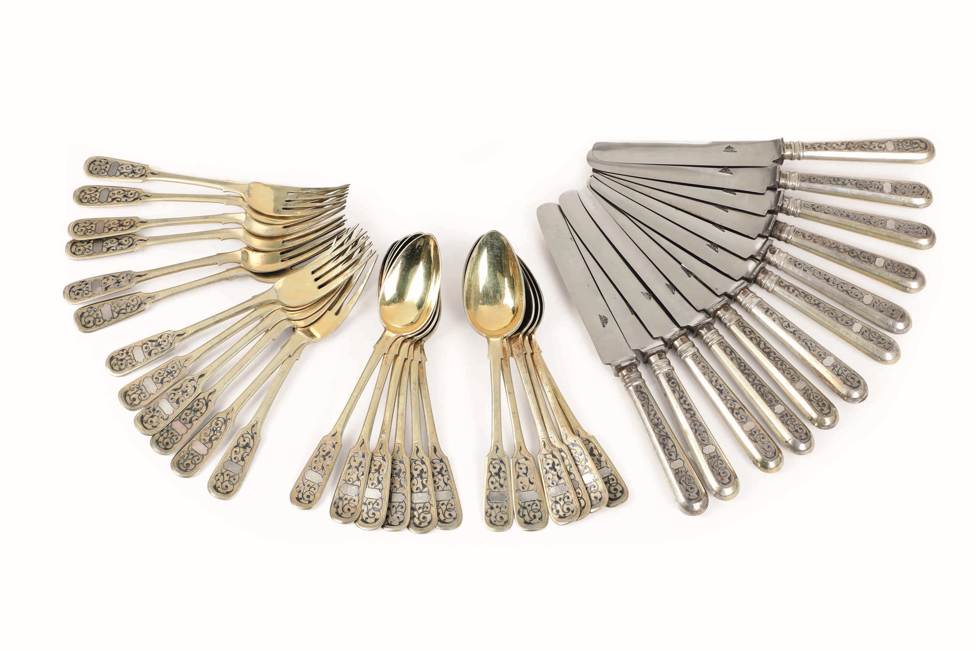 Servizio posate da dolce. Argento fuso, sagomato, dorato e niellato. Mosca 1872. [..]