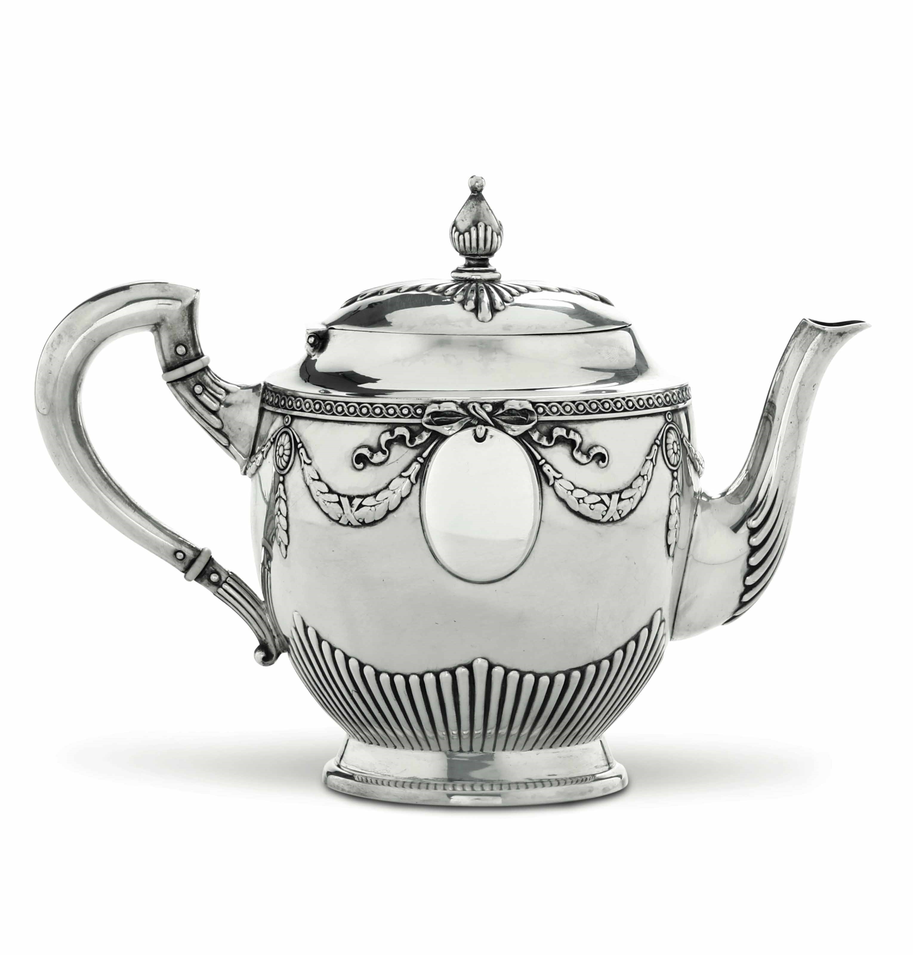 Teiera. Argento fuso, sbalzato e cesellato. Germania (bolli importazione Russia) [..]