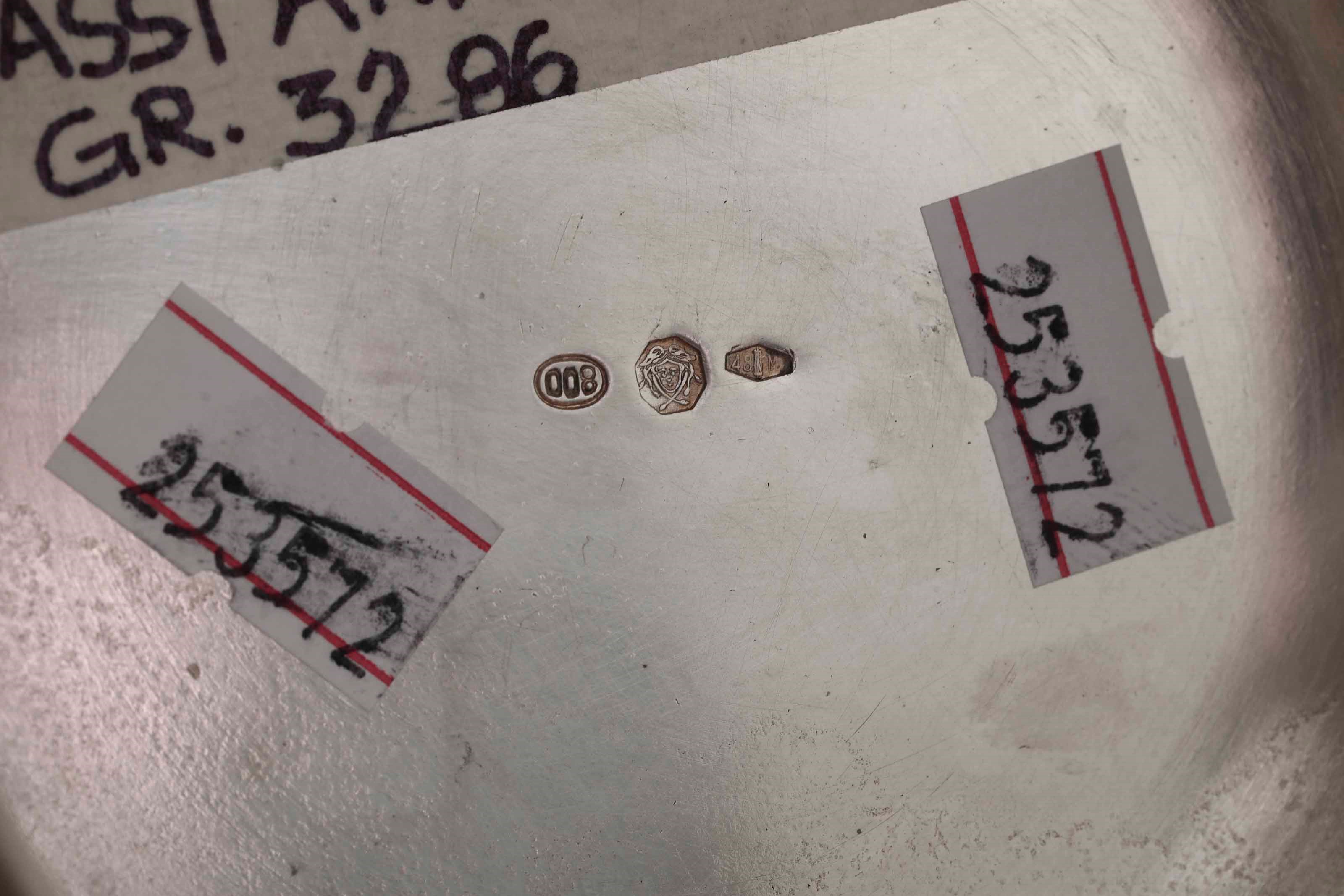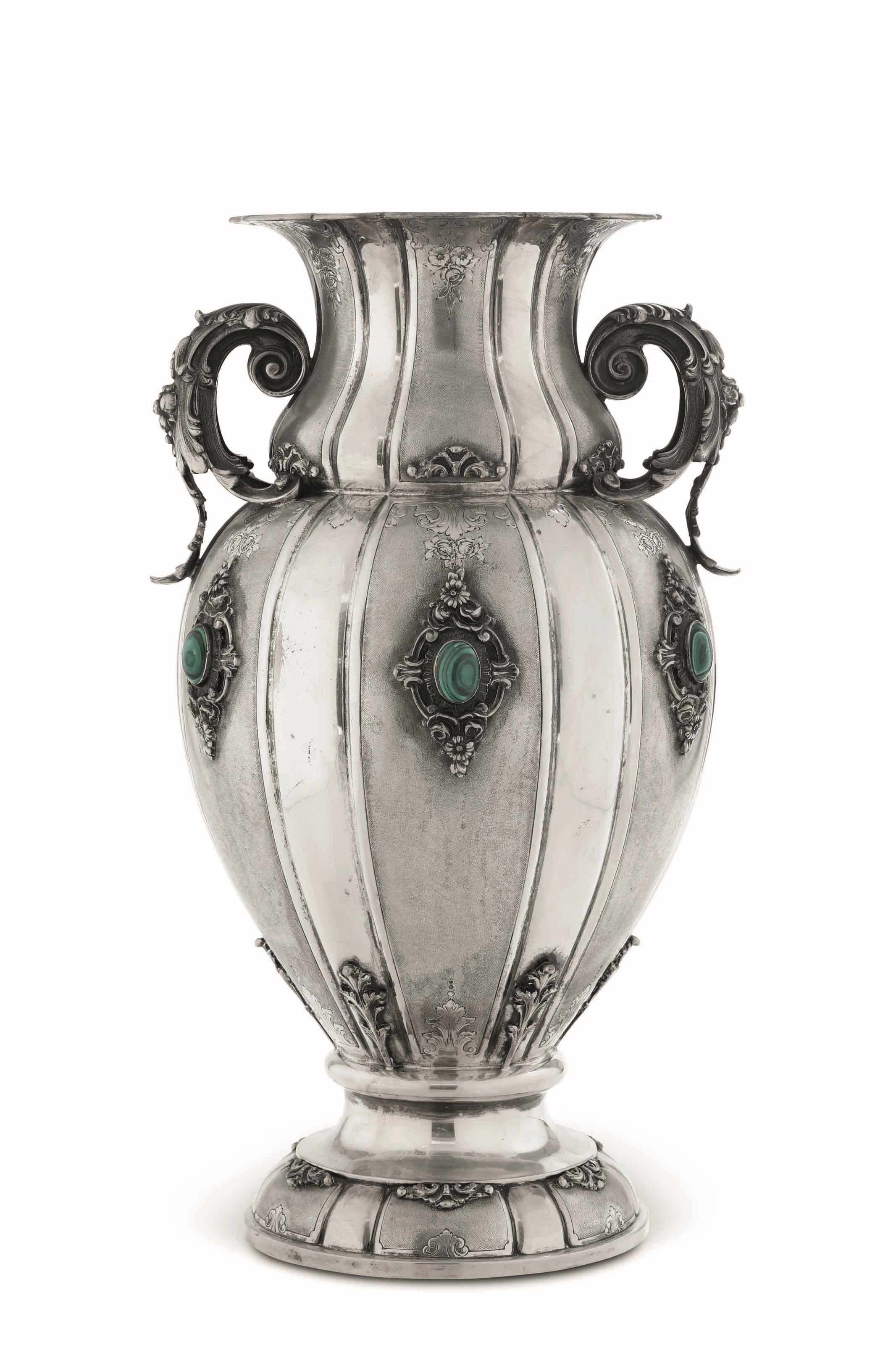 Vaso. Argento fuso, sagomato, cesellato e cabochon in malachite. Argenteria artistica [..]