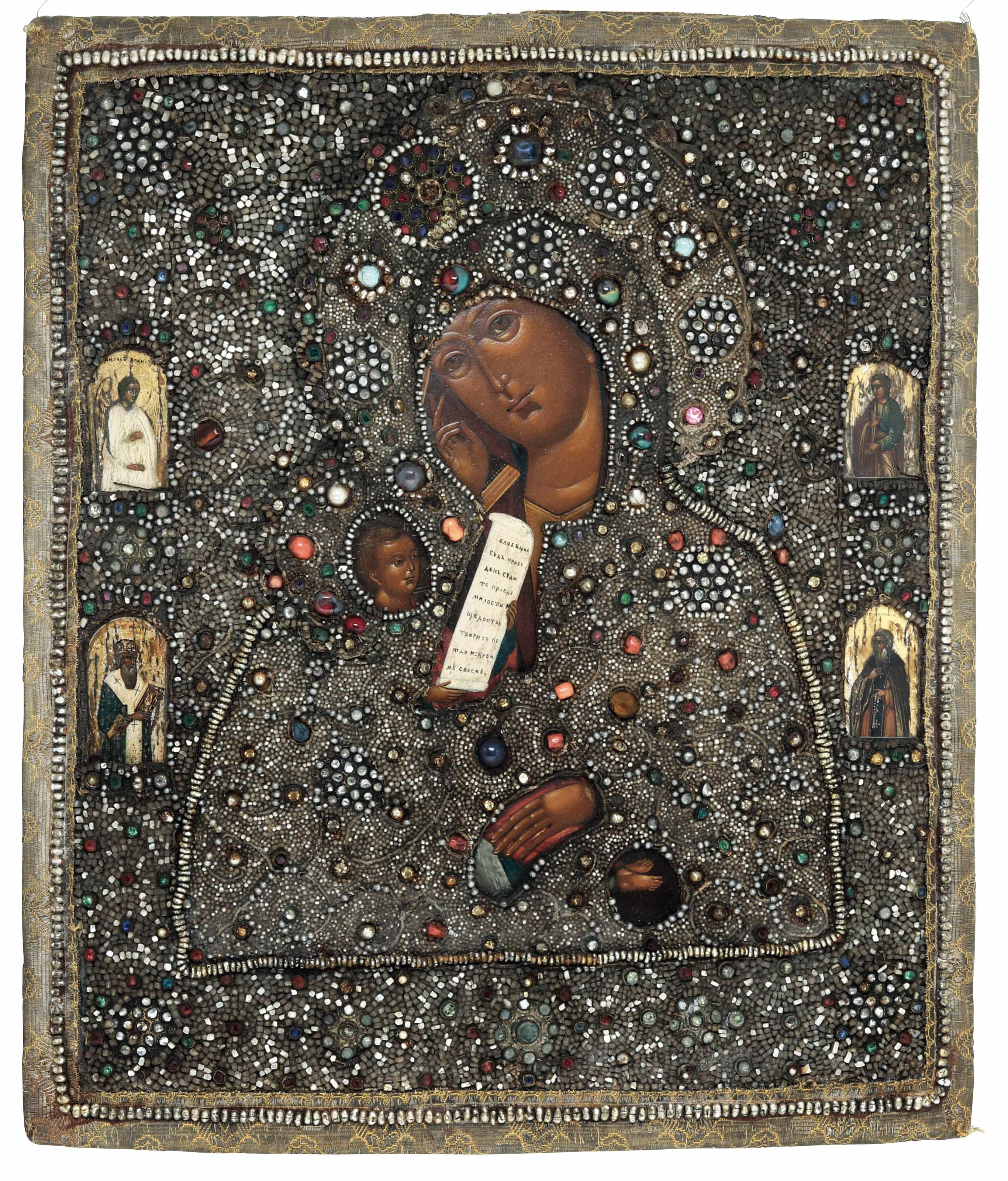 Vergine con Bambino. Riza in perline, pietre colorate e corallo. Palech, fine XVIII [..]