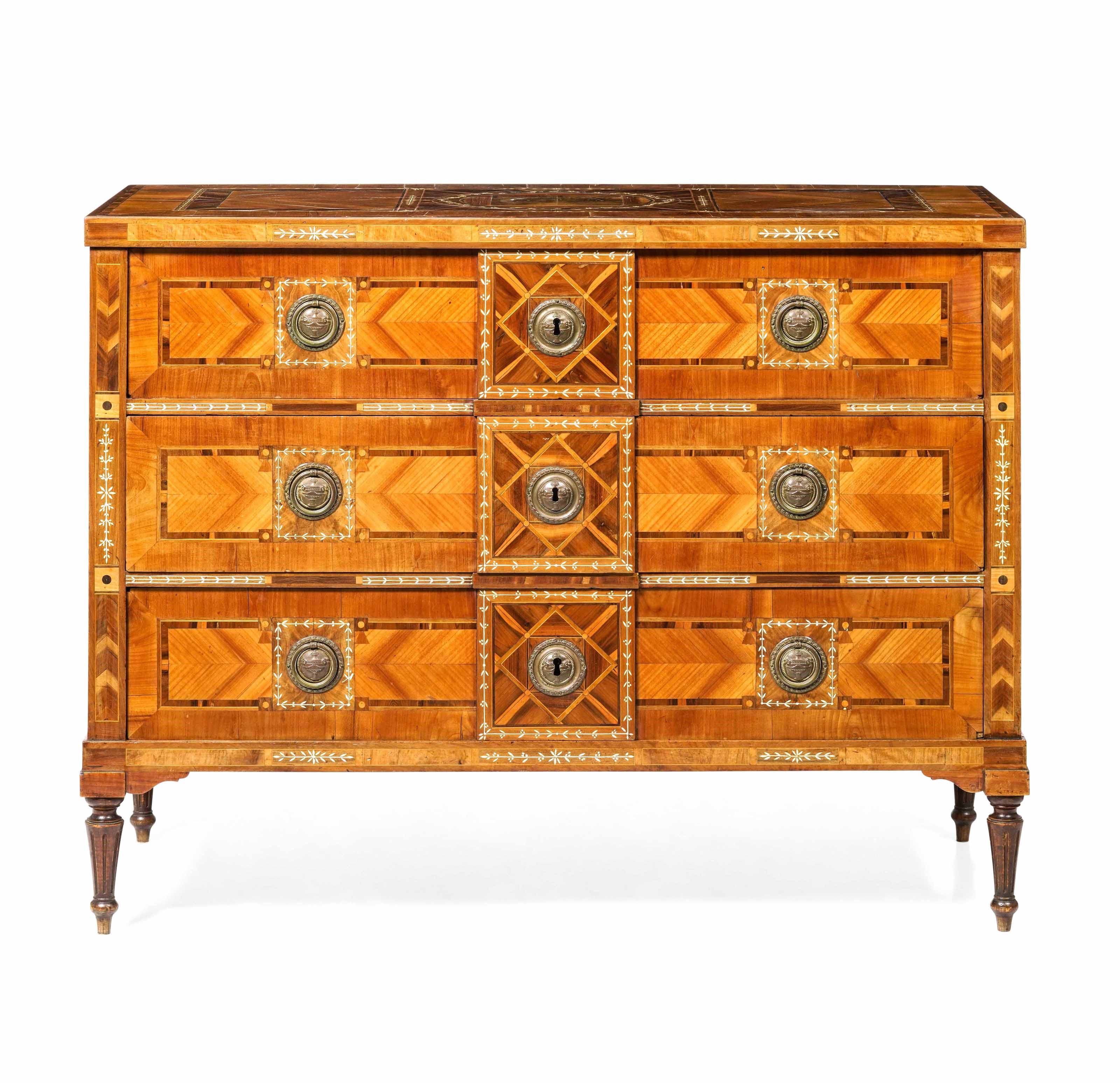 Cassettone lastronato, filettato e intarsiato. XVIII-XIX secolo