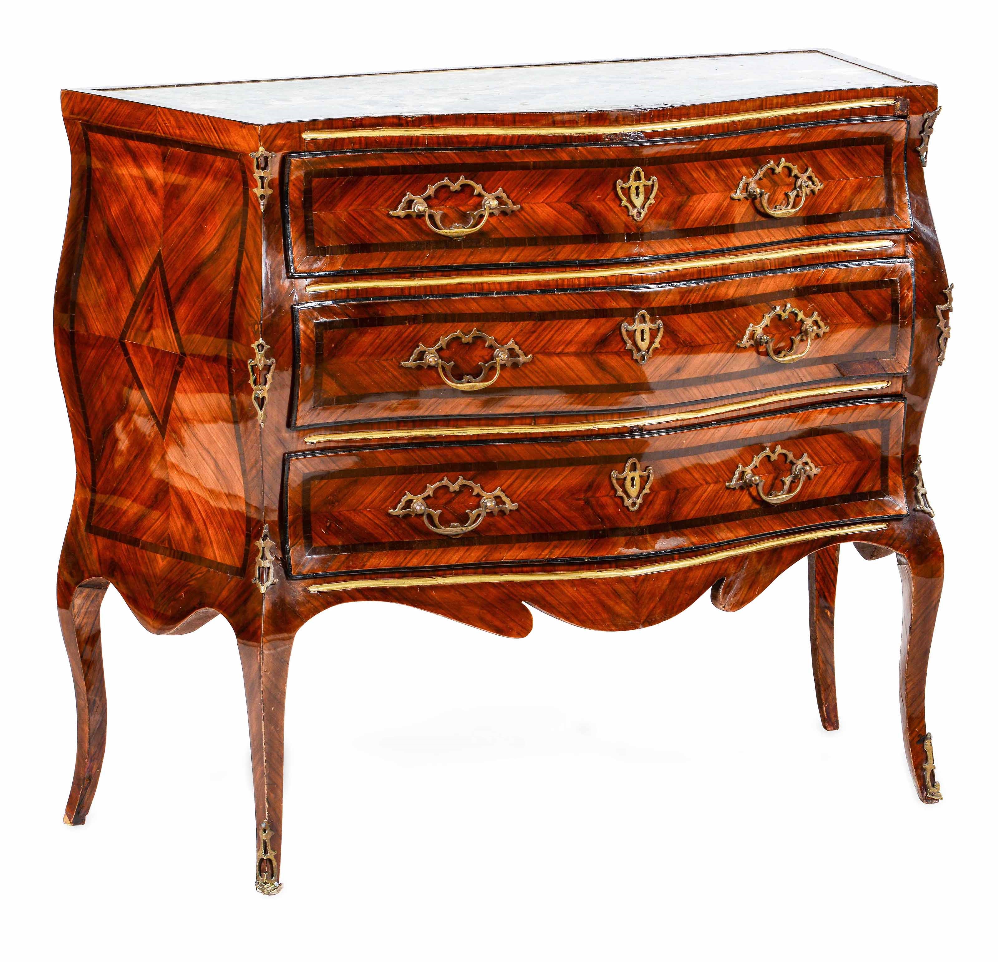 Coṃ a tre cassetti in legno lastronato e intarsiato. Sicilia, XVIII secolo