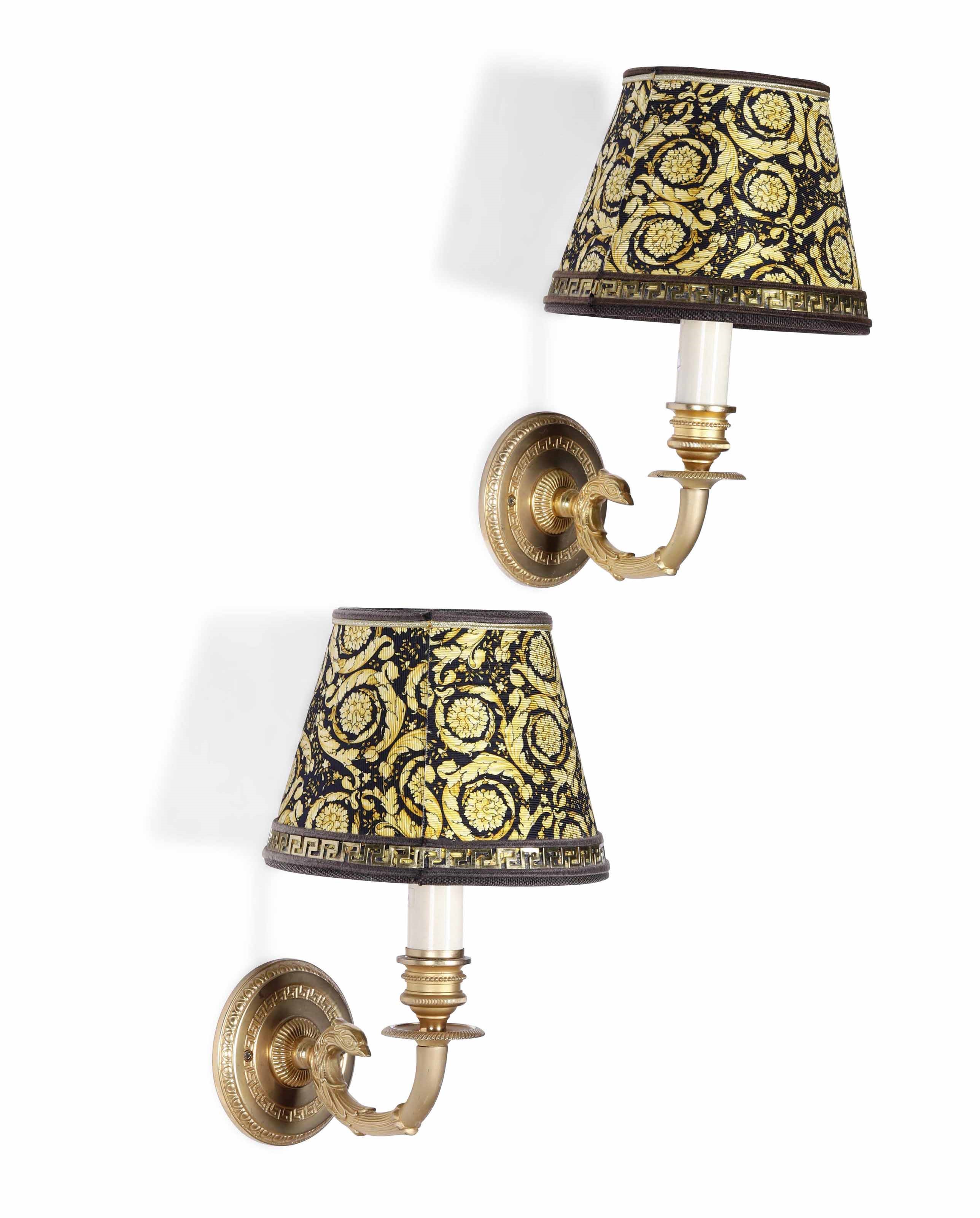 Coppia di appliques in bronzo dorato con paralumi in stoffa Versace