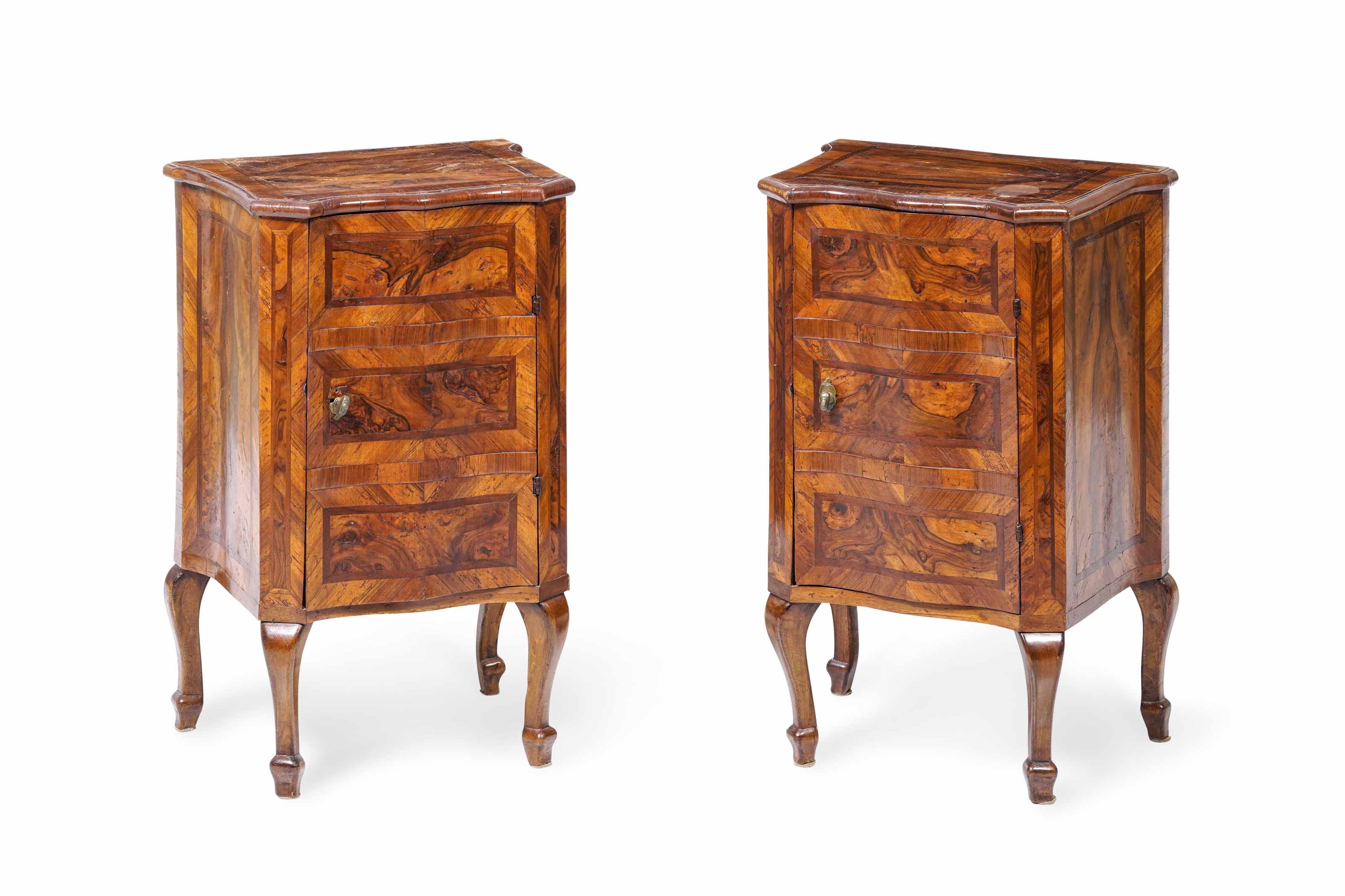 Coppia di comodini lastronati in radica e filettati. Veneto, XVIII secolo