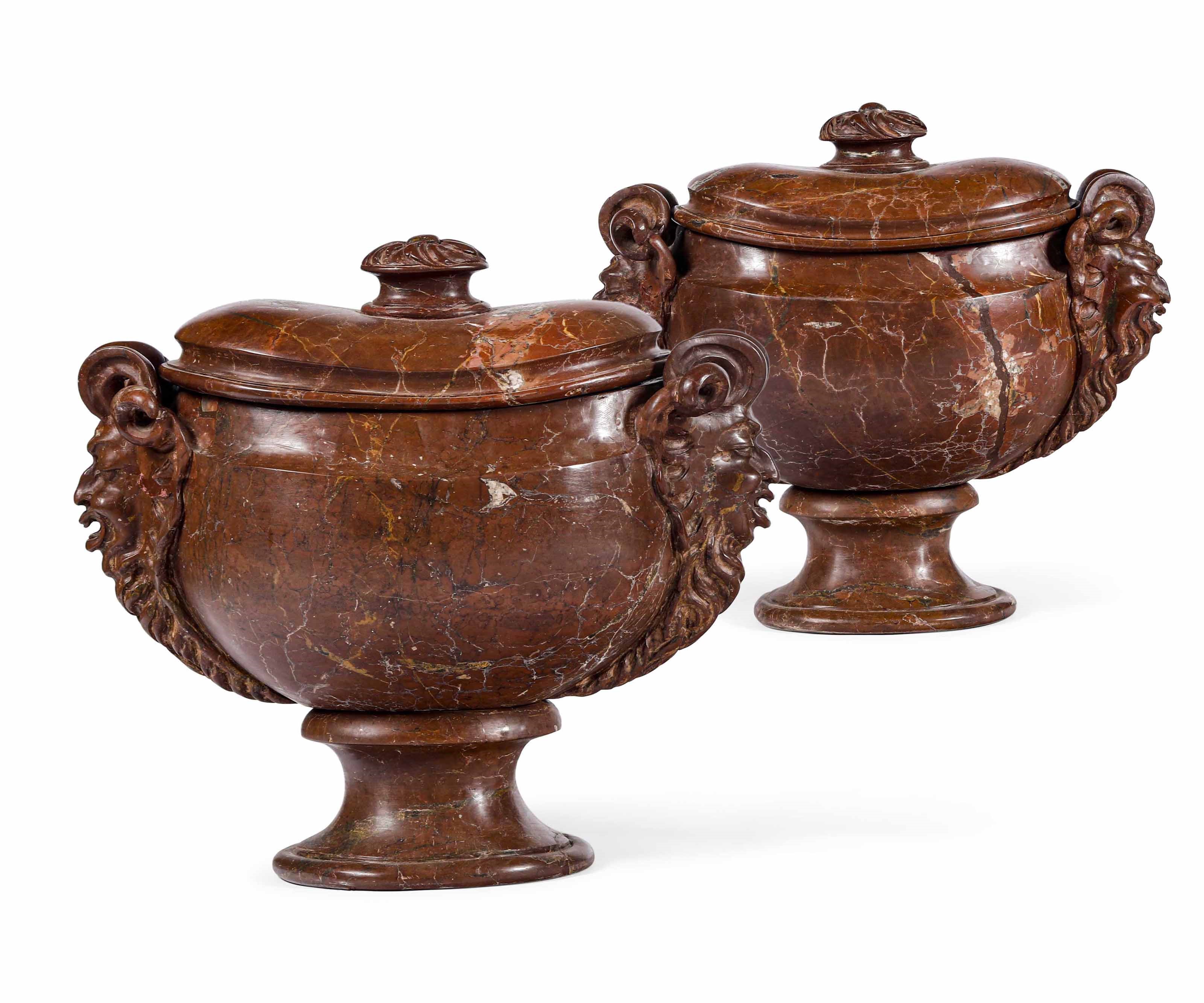 Coppia di imponenti vasi con coperchio in marmo rosso francese (Rouge Royale?)