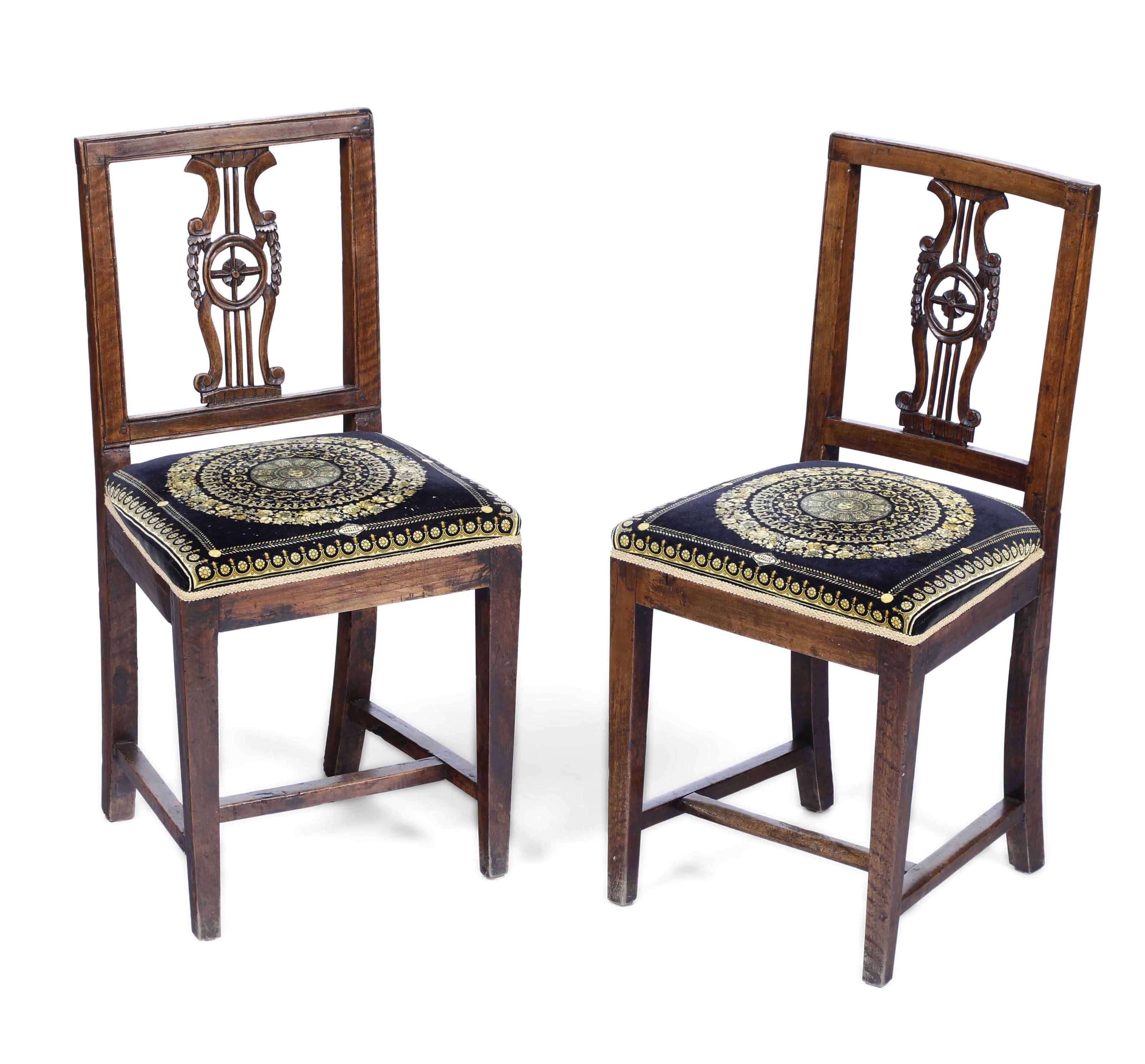Coppia di sedie con schienale intagliato a cartella e seduta rivestita in velluto [..]
