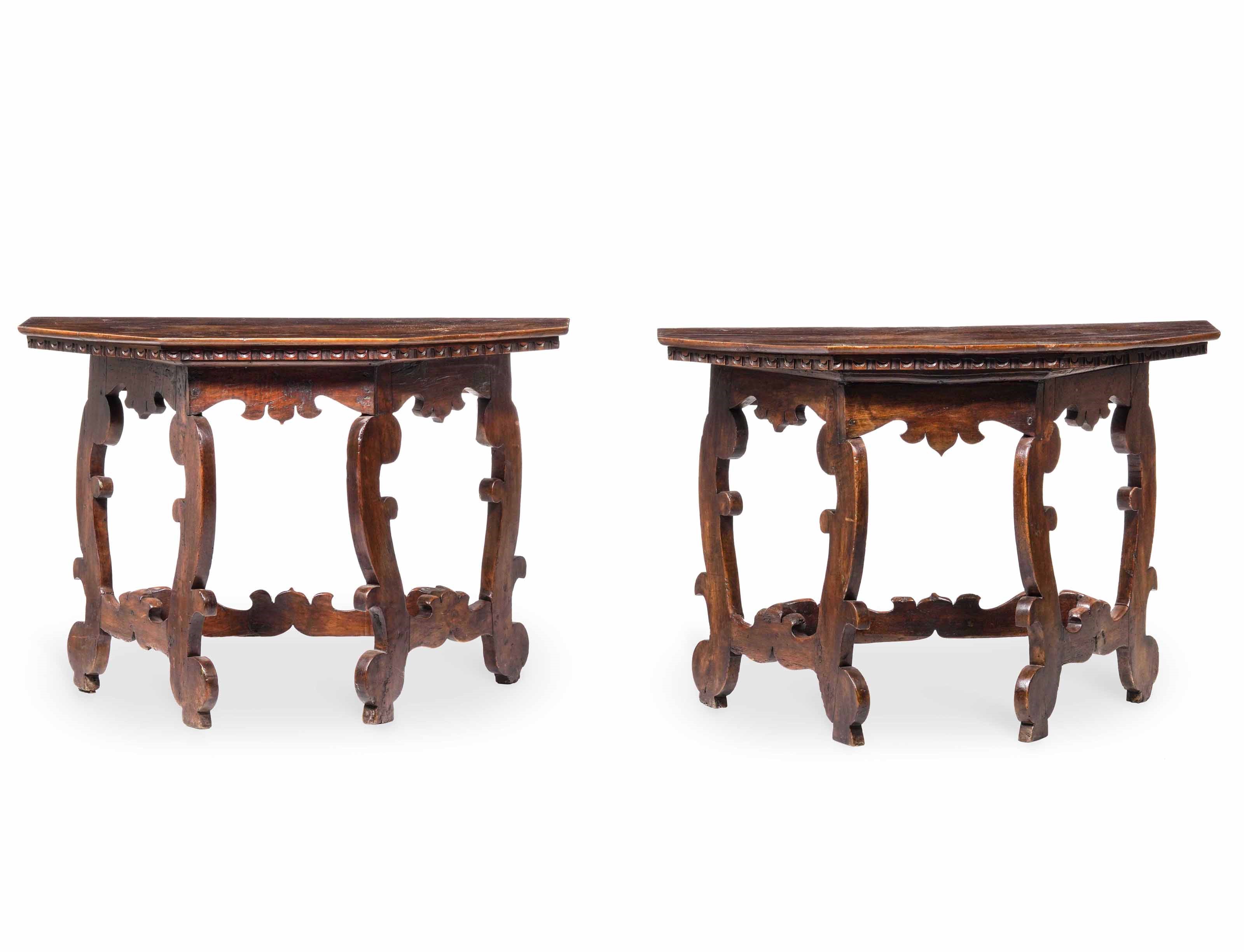 Coppia di tavoli da parete in noce intagliato, elementi antichi