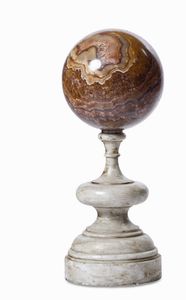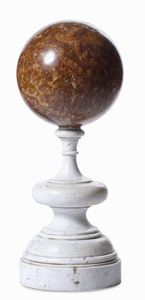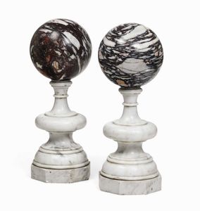 Due sfere in breccia di Sciro su basi in marmo bianco
