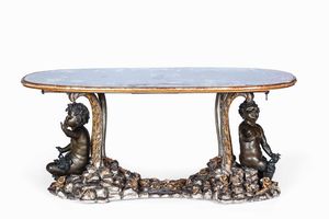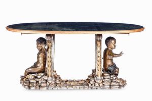 Tavolo in legno intagliato, dorato con putti in bronzo patinato. XX secolo
