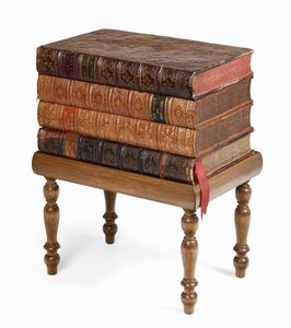 Scatola in forma di antichi tomi impilati su base in legno tornito. Francia, XX [..]