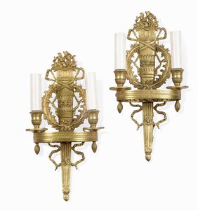 Coppia di appliques a due luci in bronzo dorato e cesellato. Francia, XIX secolo