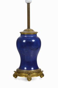 Vaso in porcellana monocroma blu con tracce di lumeggiature color oro. Cina, Dinastia [..]