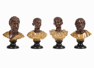 Quattro busti di poeti e imperatori. Resina dipinta. XX secolo
