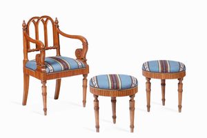 Poltrona e coppia di sgabelli, XIX-XX secolo