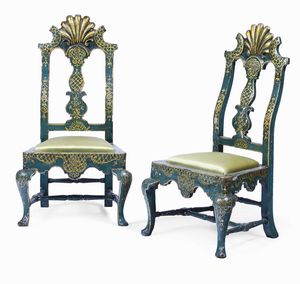 Coppia di sedie in legno laccato e dorato. Inghilterra, XIX secolo