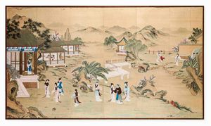 Grande dipinto su carta raffigurante scena di vita comune con saggio e fanciulle [..]