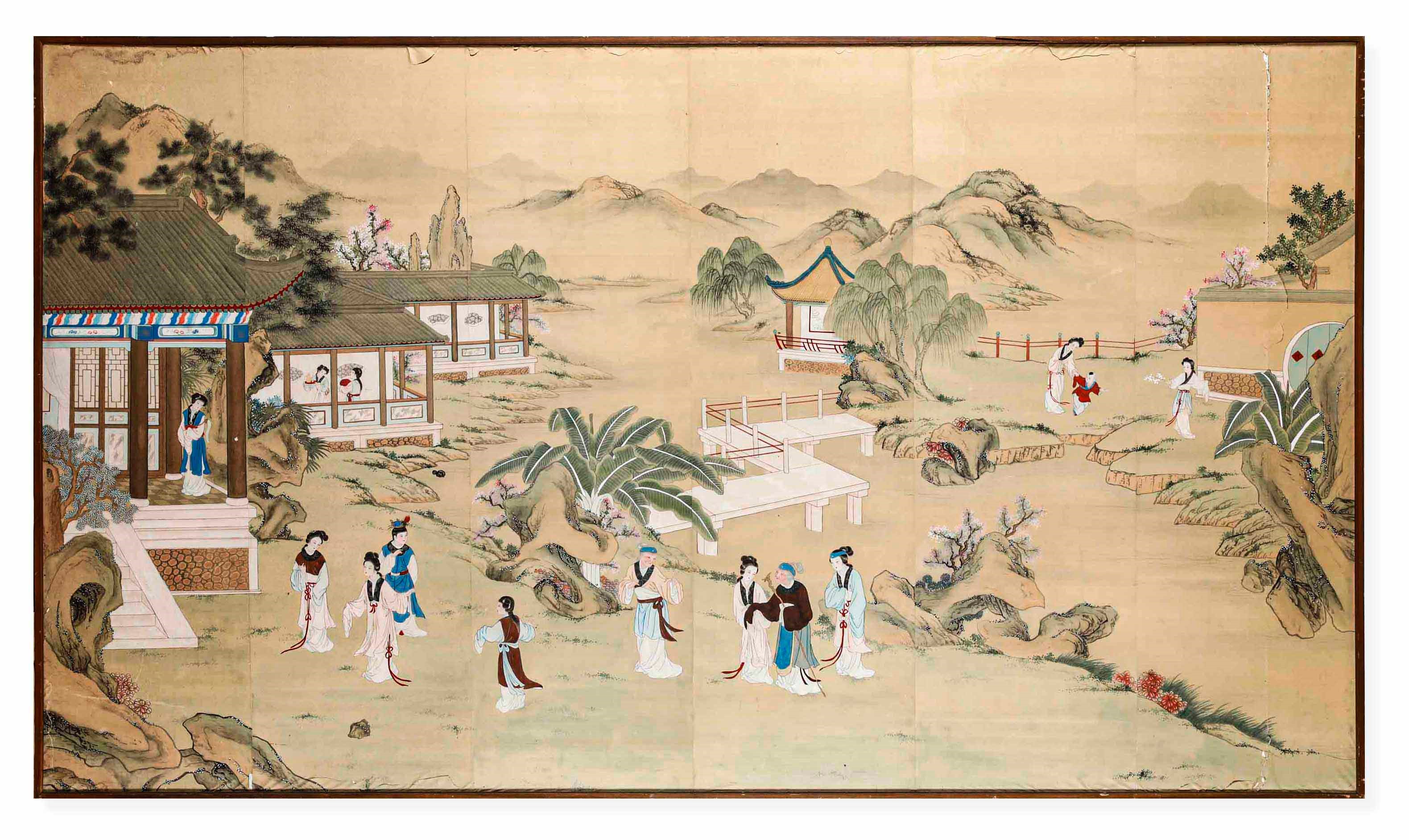Grande dipinto su carta raffigurante scena di vita comune con saggio e fanciulle [..]