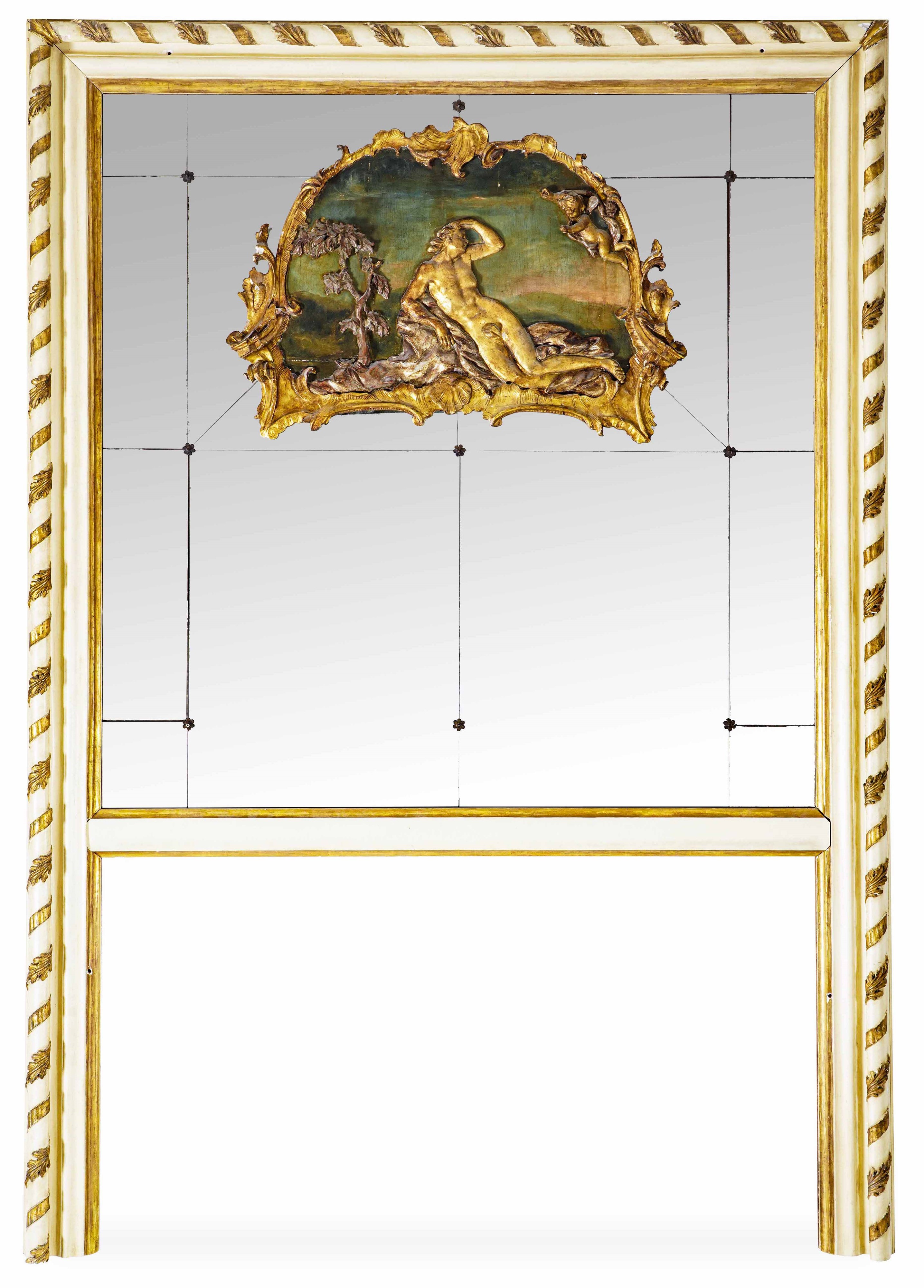 Grande specchiera fondosala in legno intagliato, laccato e dorato, XIX secolo