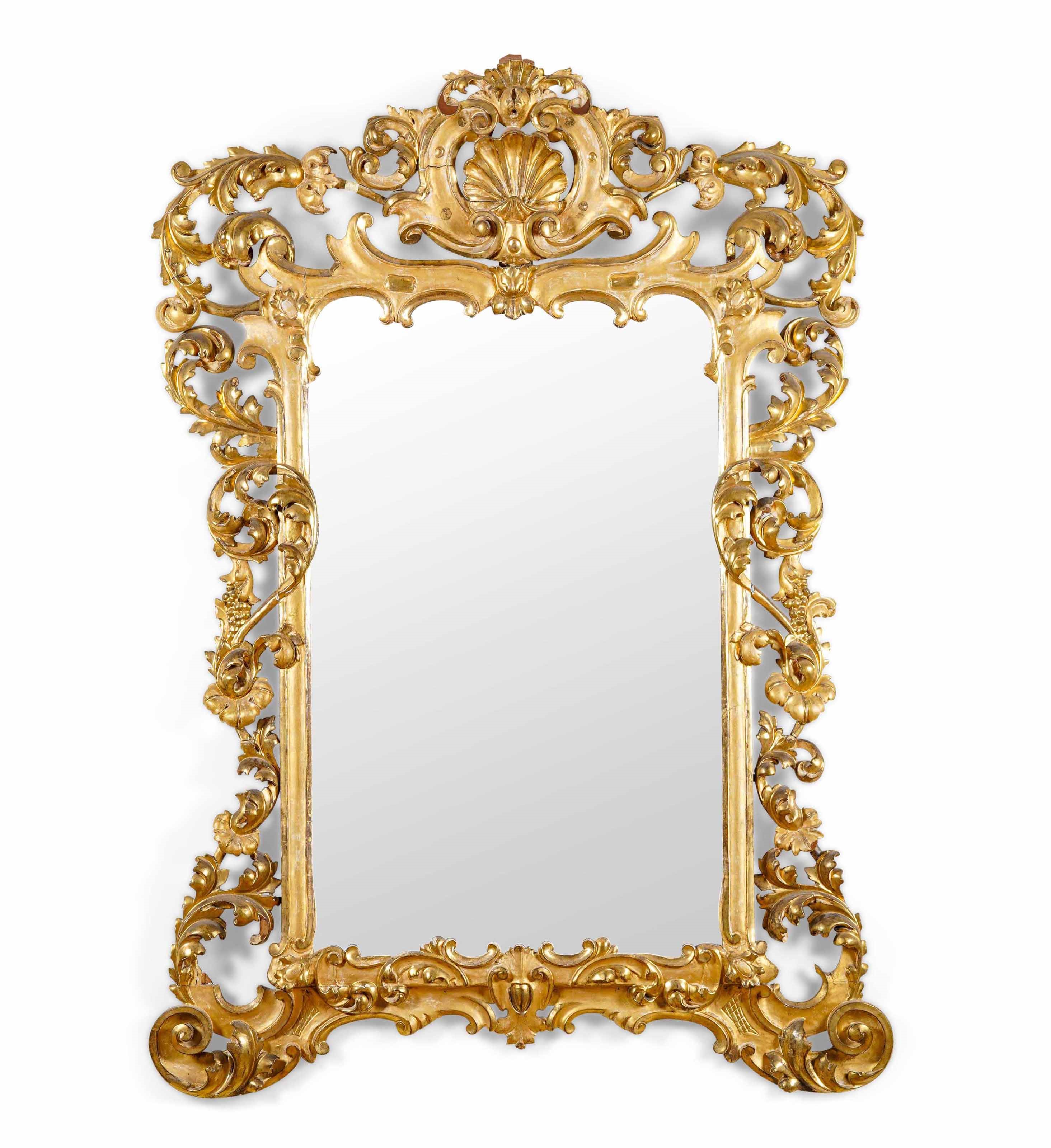 Grande specchiera in legno intagliato, traforato e dorato. XIX secolo