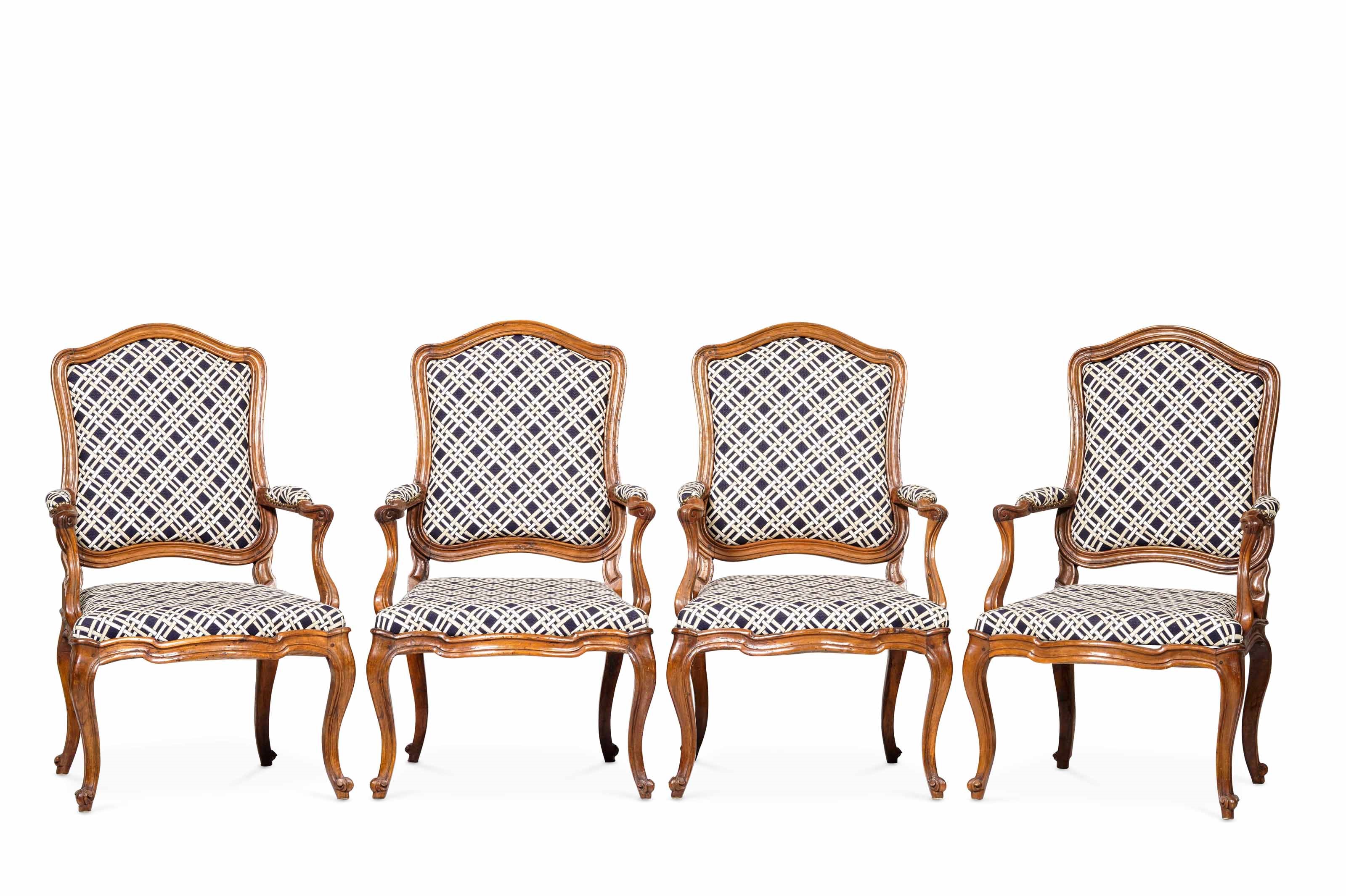 Gruppo di quattro poltrone Luigi XV in noce. Piemonte, XVIII secolo