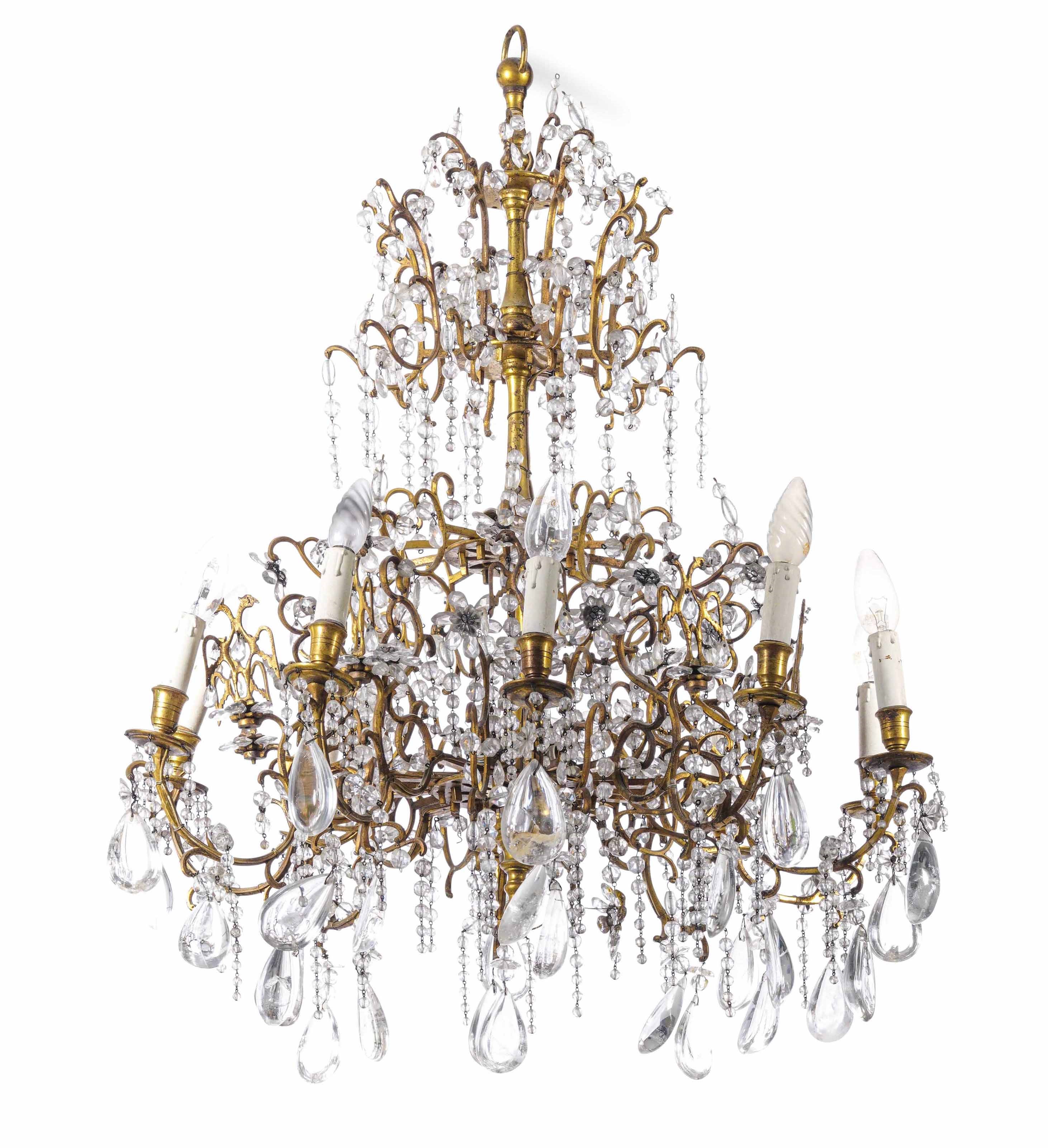 Lampadario a dieci luci in bronzo con pendenti in cristallo. XIX secolo