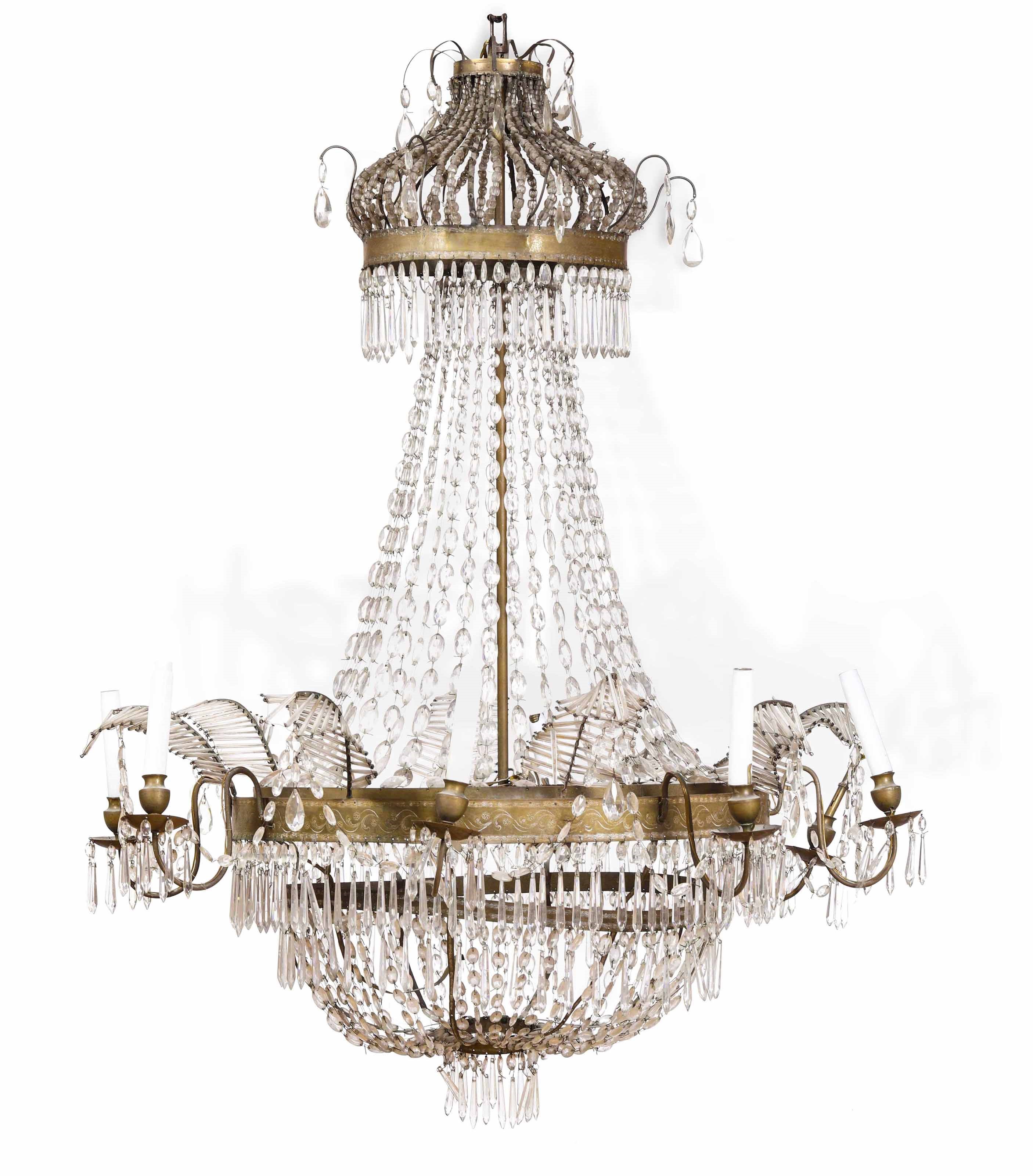 Lampadario a otto luci in bronzo patinato, dorato e gocce di cristallo. Francia, [..]