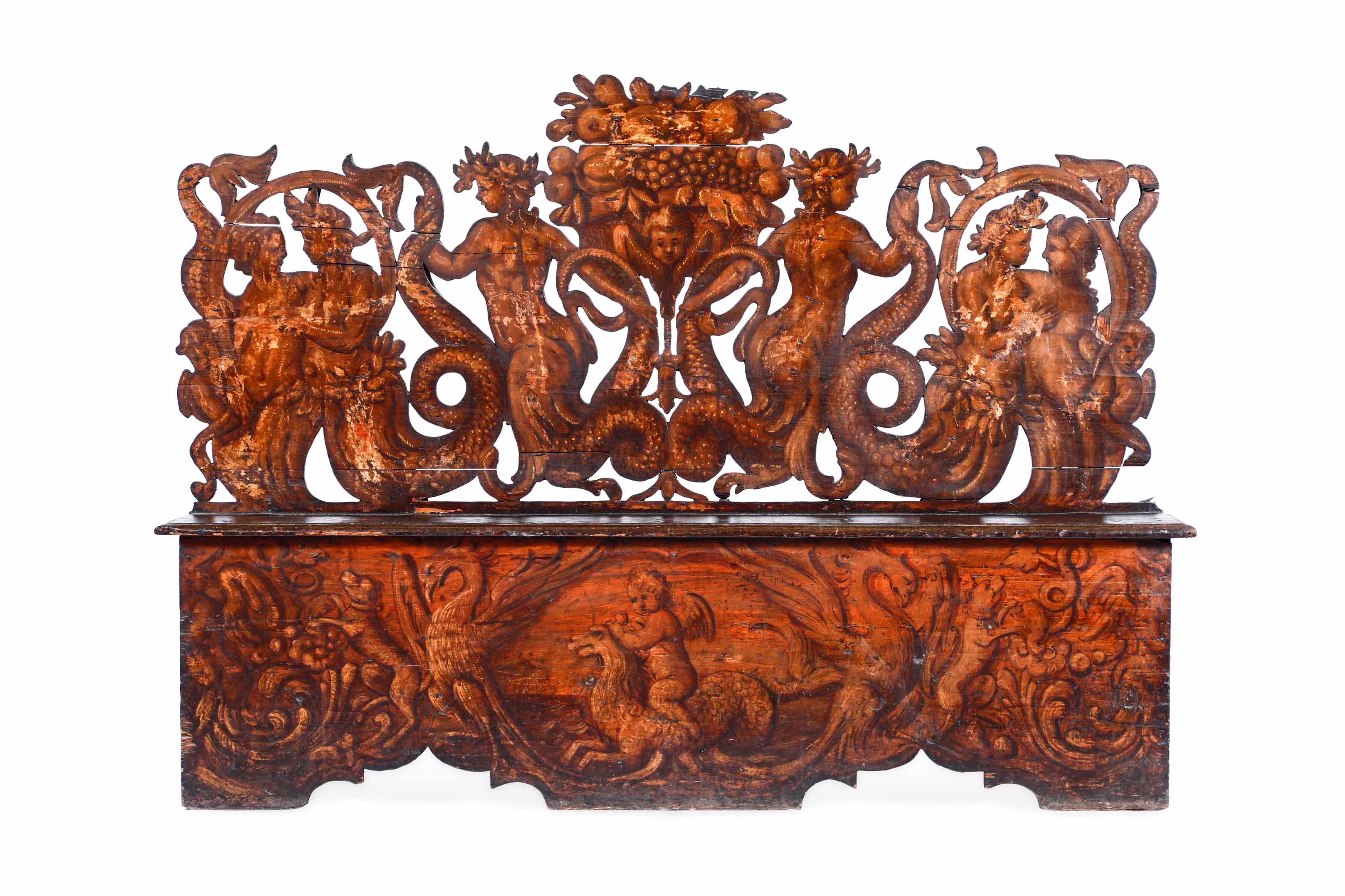 Panca in abete dipinto e traforato. XVII-XVIII secolo