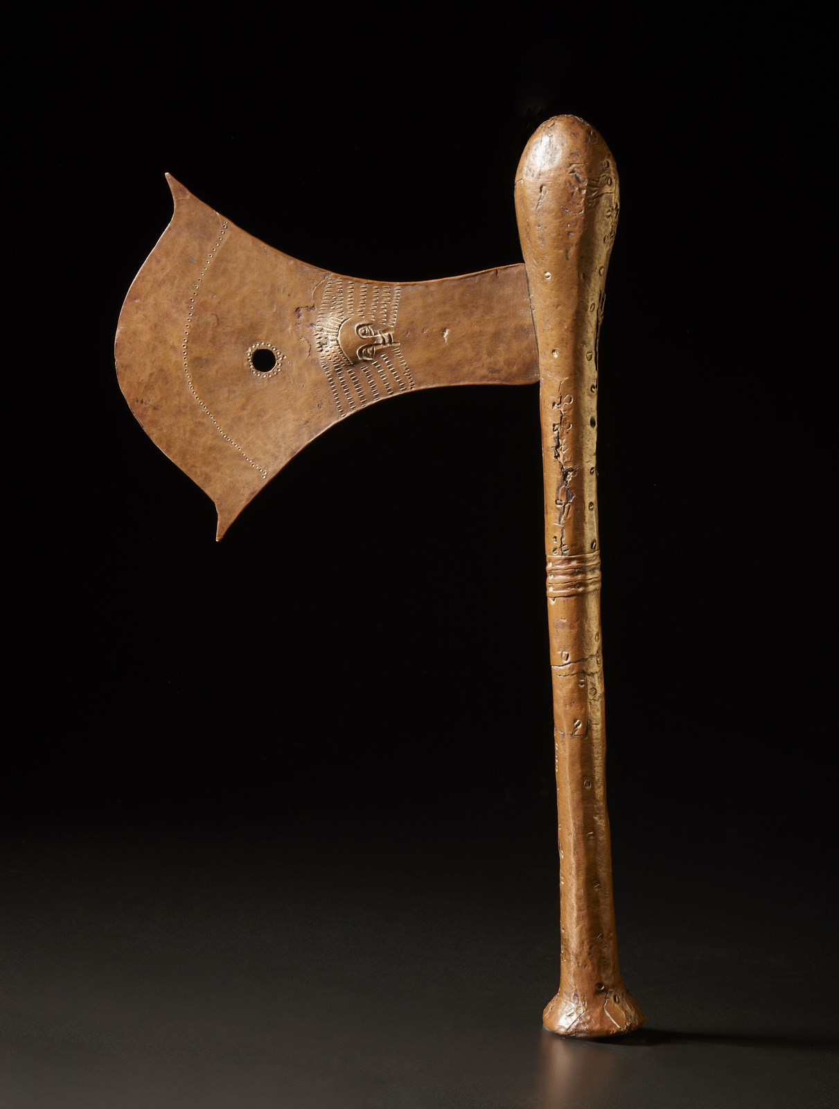 Circa un'ascia in rame come questa, un autore anonimo scriveva su una rivista del 1896 che non si trattava di uno strumento di guerra o di lavoro, ma di insegne che i capi locali rimettevano nelle mani dei loro emissari e testimoniavano cosi i poteri a volte anche molto estesi, dati allo stesso.Questo splendido esemplare di ascia Kilonda completamente rivestito in rame rosso, ad eccezione di una piccola parte in ferro che con ogni probabilità serviva da ''bandiera'' ossia a rappresentare un preciso proprietario o re, è caratterizzata da diverse decorazioni geometriche, da un foro e da un faccino stilizzato con magistrale sintesi ed espressività, forgiato ed inciso nel rame su entrambi i lati della lama.Un faccino quasi identico lo ritroviamo rappresentato anche sulla lama a due rami della Kilonda ex coll. Josef Mueller, pubblicata a pag. 247 del libro De fer et de fierté, Armes blanches d'Afrique noir du musée Babier-Mueller, scritto da Jan Elsen per 5 Continents Editions, 2003.