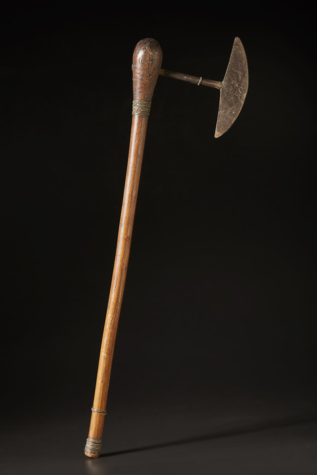 Ascia con ampio tagliente in ferro innestato nella parte alta del manico'' a bulbo'' che risulta appesantito da chiodi in ferro per essere utilizzato anche come arma contundente.Gli anelli in fil di ferro intrecciato presenti servivano da bandiera, ossia permettevano al legittimo proprietario di recuperare la propria arma senza possibilità di confonderla con quella di altri cacciatori o dopo averla lanciata durante gli scontri in battaglia.