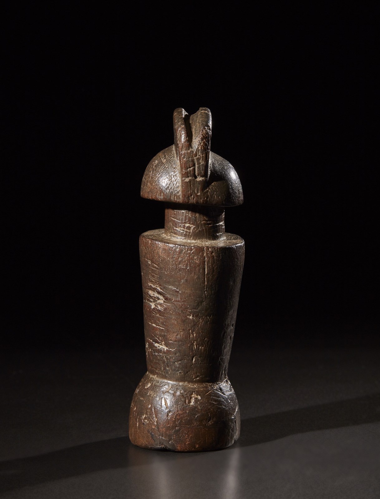 Bambola di fertilità di estrema sintesi con un corpo cilindrico che enfatizza i soli fianchi, canone di bellezza e femminilità ed una grande testa con un minimo volto solo accennato, ma diversi fori su cui applicare veri capelli umani, altro importante canone di bellezza e femminilità delle bambine Zaramo.Evidentemente molto usata.