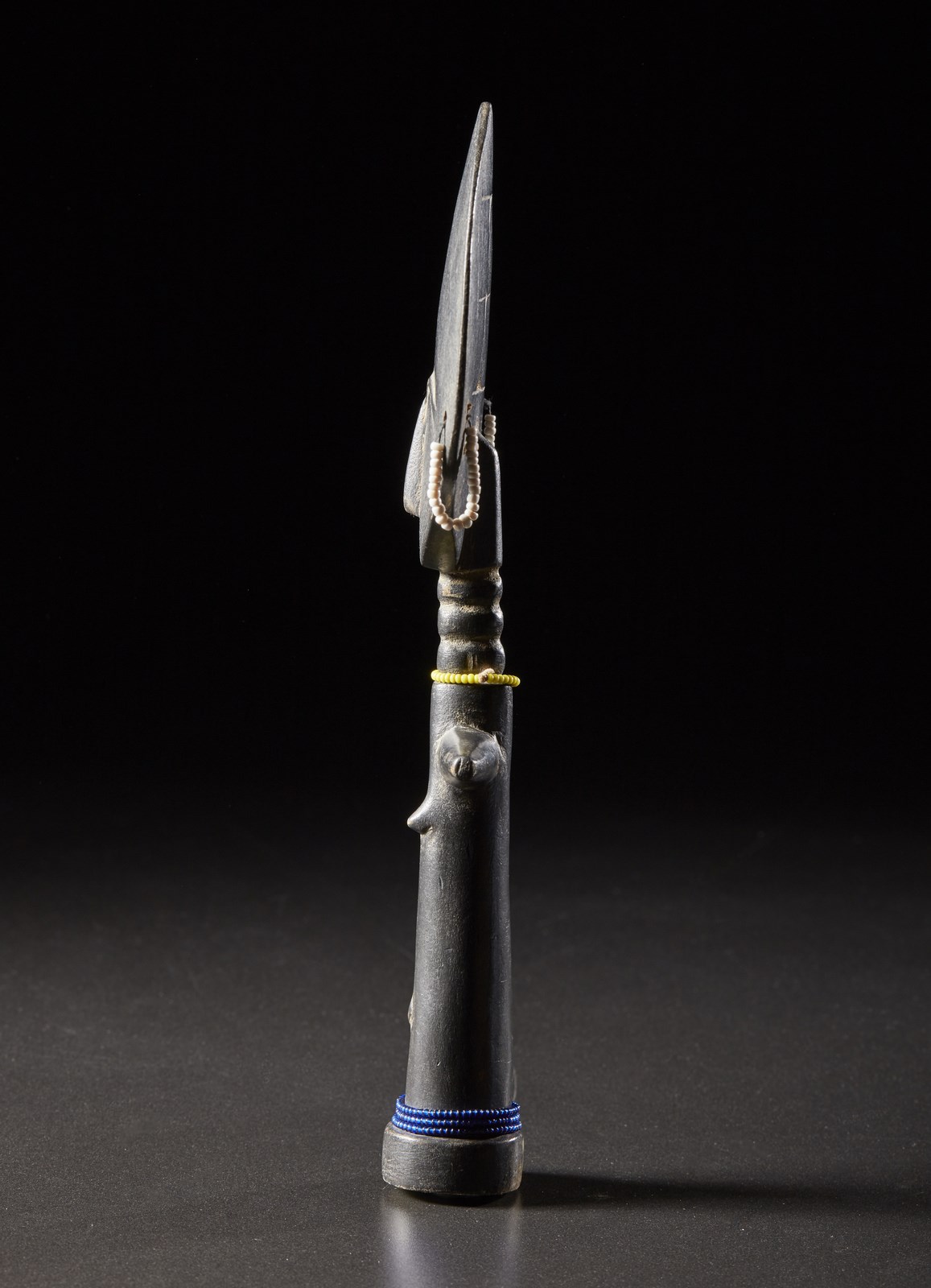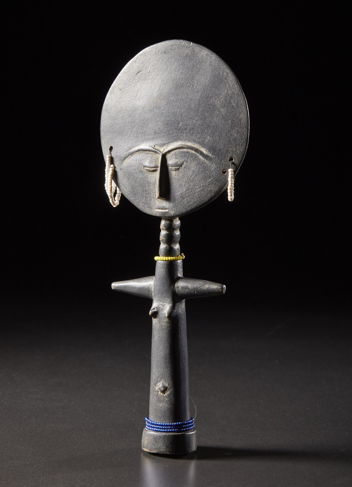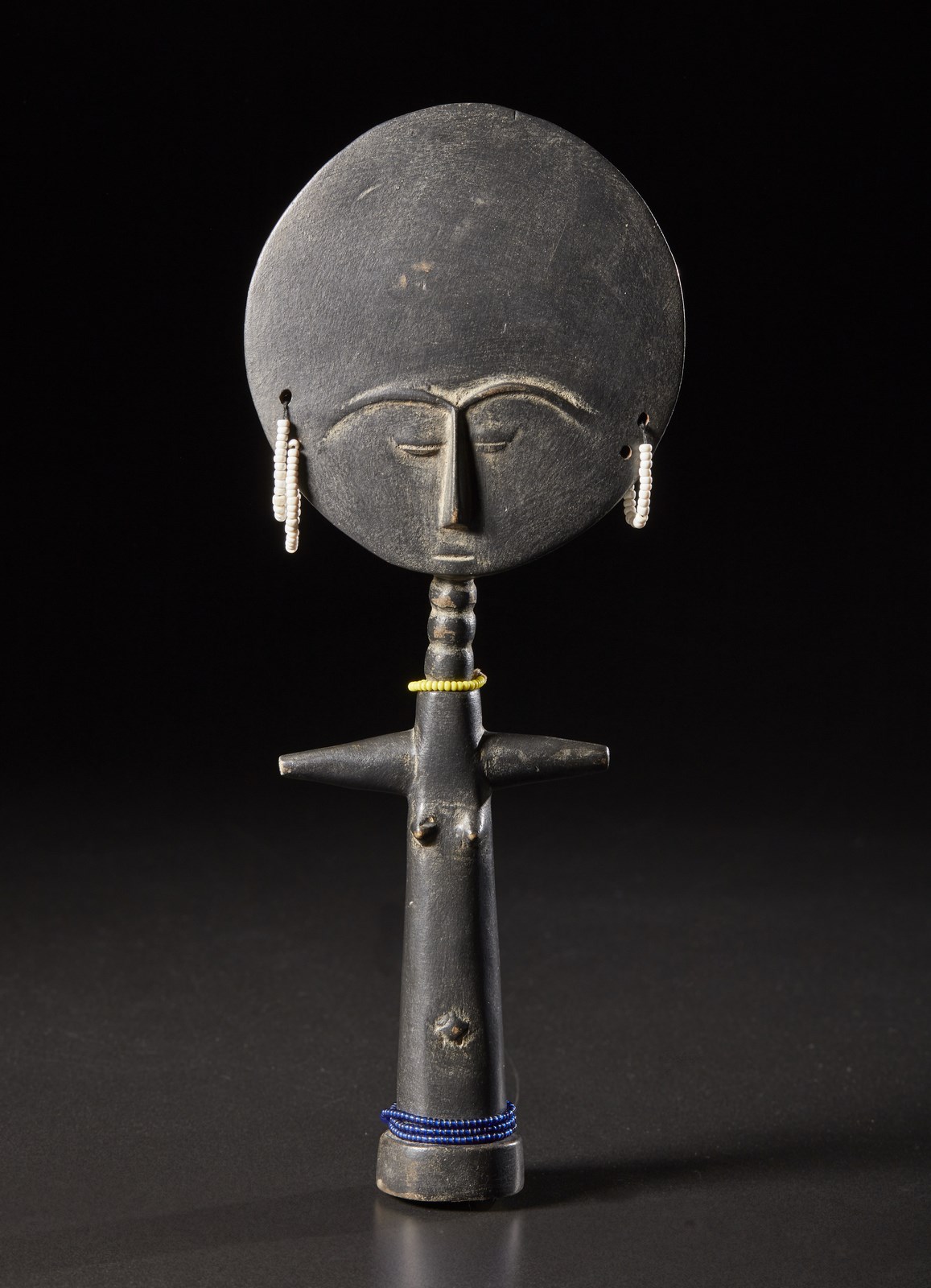 Bambola di fertilità o Akua' ba.Legno duro a patina scura, perline.Segni d'uso.