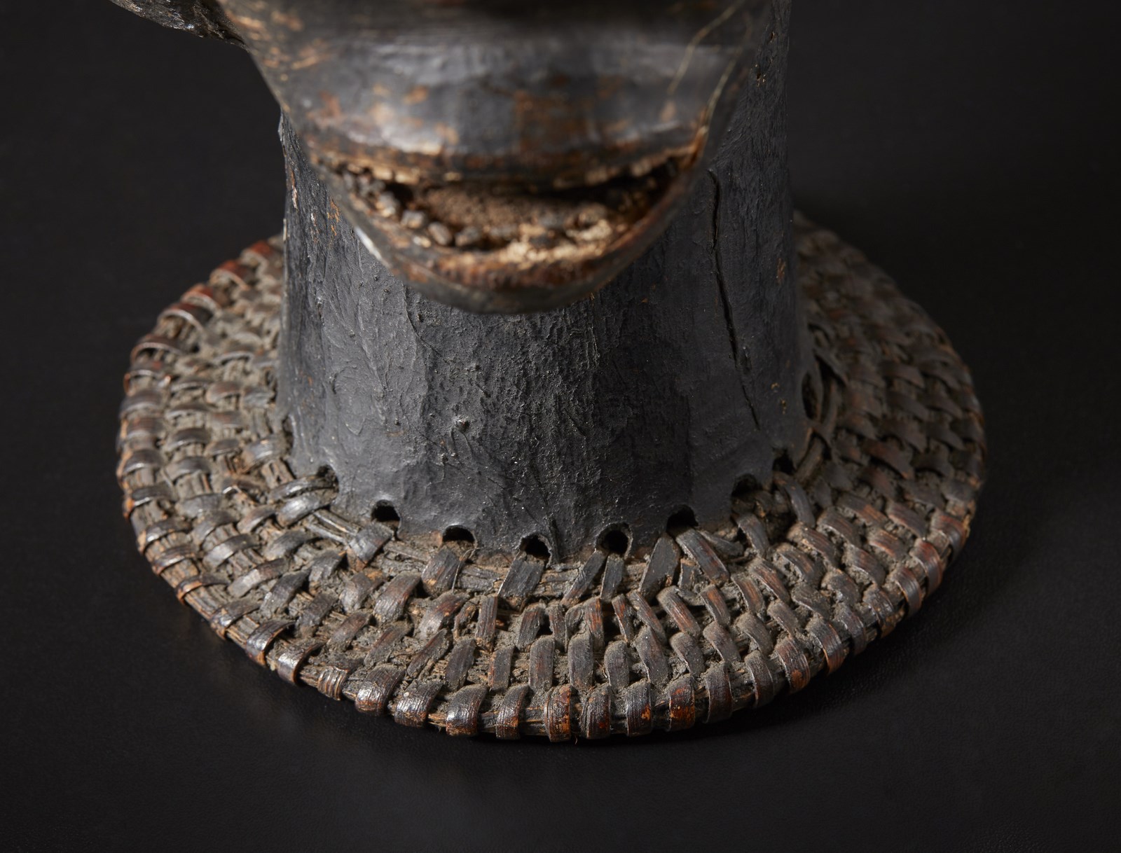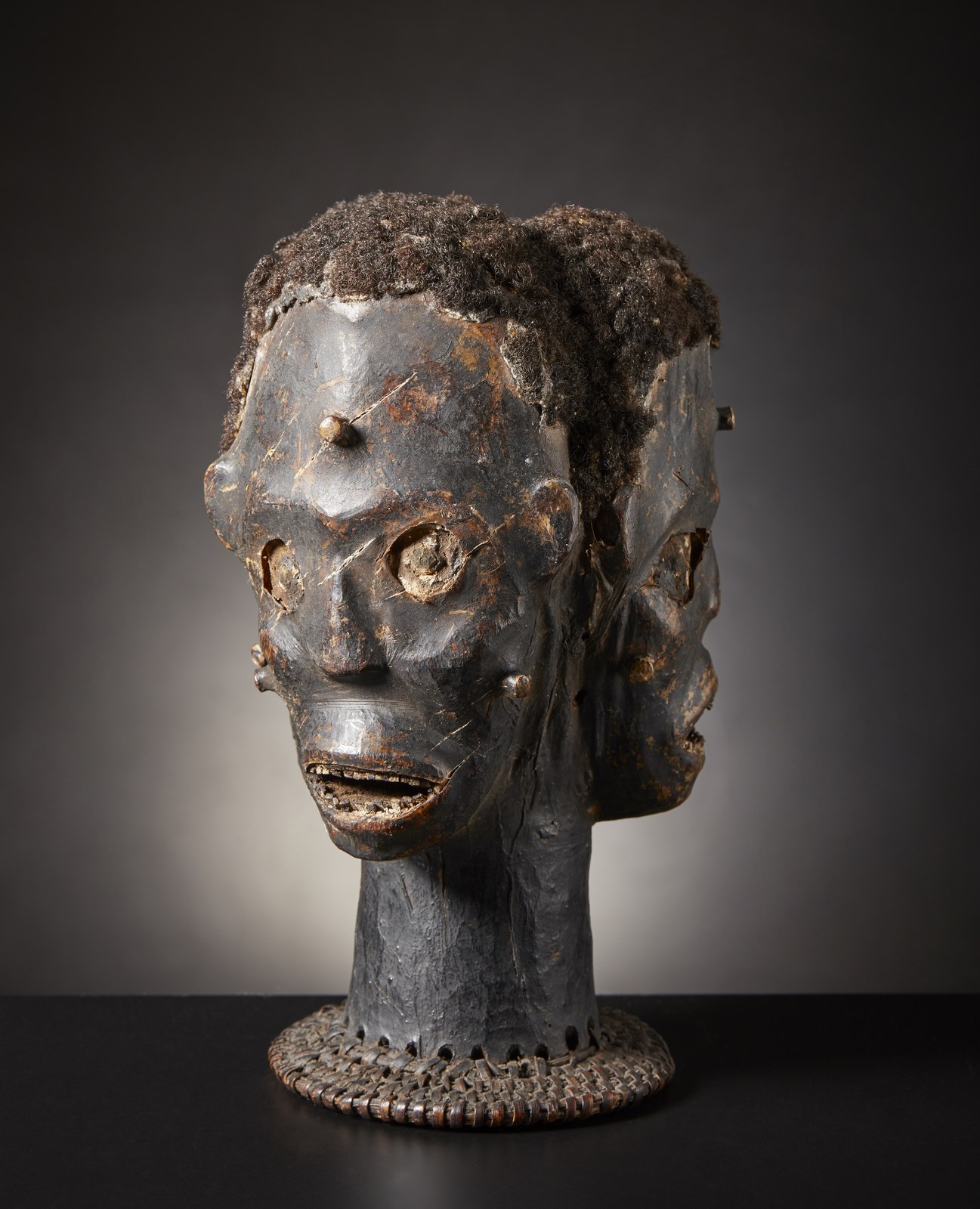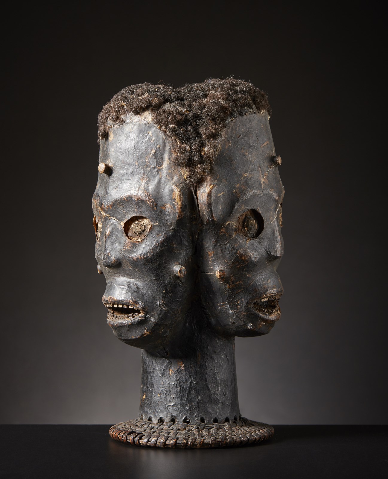 Espressivo cimiero a forma di testa umana con tre facce esibito durante le danze di alcune società iniziatiche dai guerrieri e tagliatori di teste della Nigeria come trofeo a testimonianza del proprio valore e dei numerosi nemici uccisi in battaglia.Realizzata applicando pelle di antilope trattata su una base di legno con supporto in vimini intrecciato, questa maschera- cimiero particolarmente intensa è stata resa ancora più drammatica grazie all'utilizzo di denti di legno e veri capelli umani.La pelle d'antilope con il tempo ha perso elasticità fino a diventare dura e tesa così da creare piccoli strappi nei punti di maggior tensione.