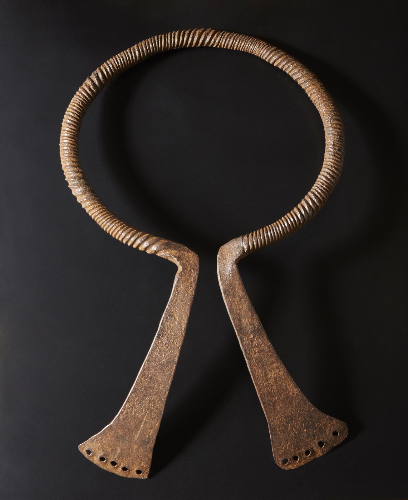 Splendida collana-moneta indossata dalle donne nobili Fali e Tupuri, ricavata da una barra di ferro ritorta numerose volte, elaboratamente incisa ed appiattita e perforata alle estremità.Con magnifica patina e segni d'uso