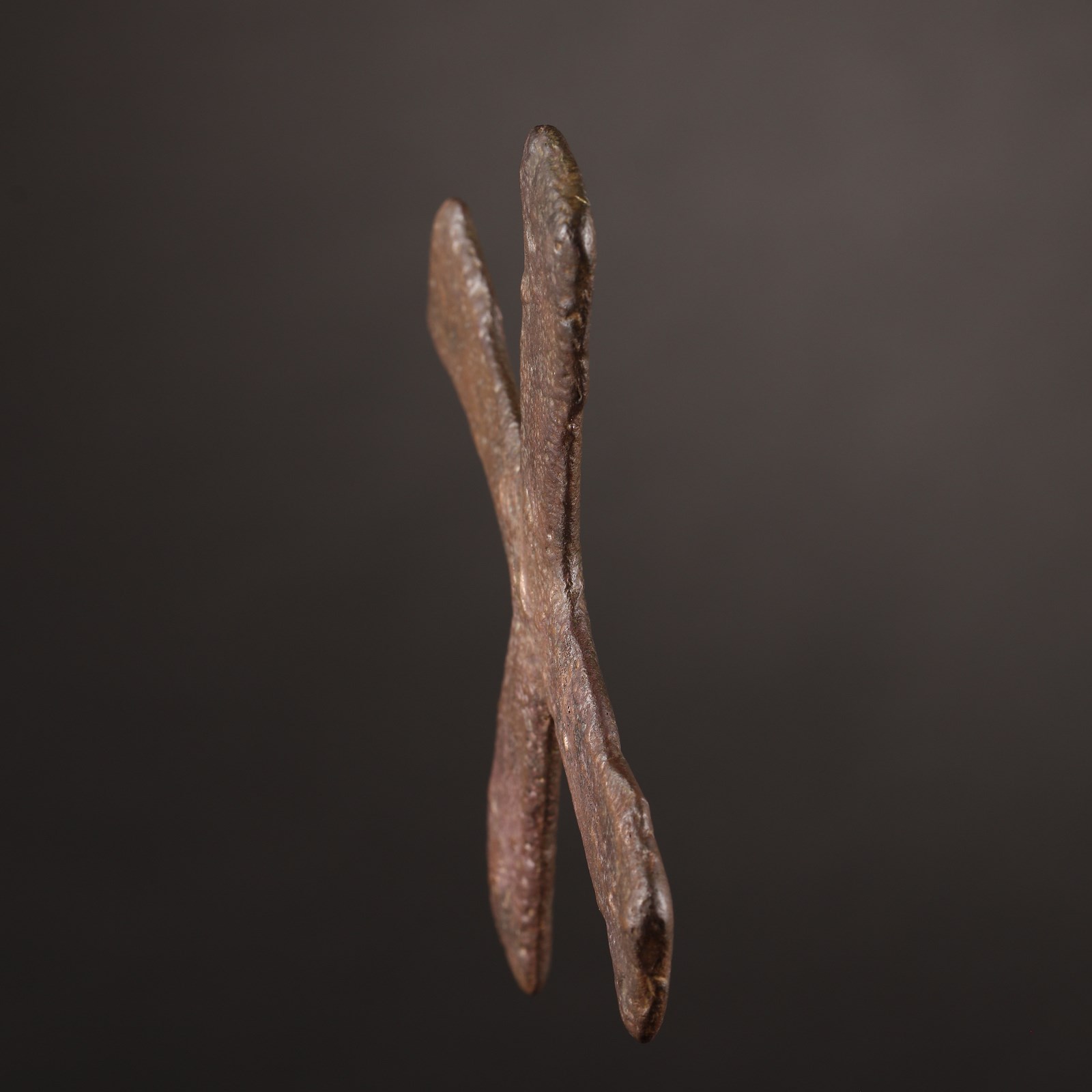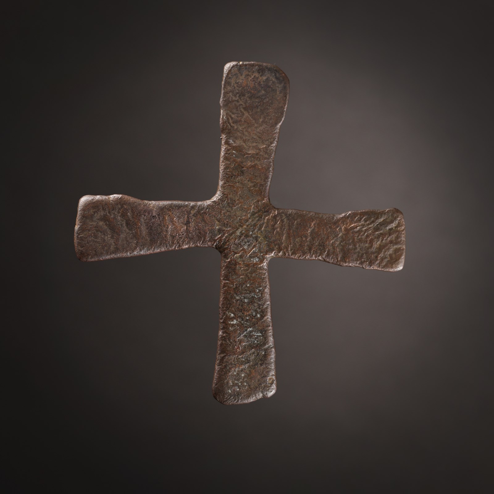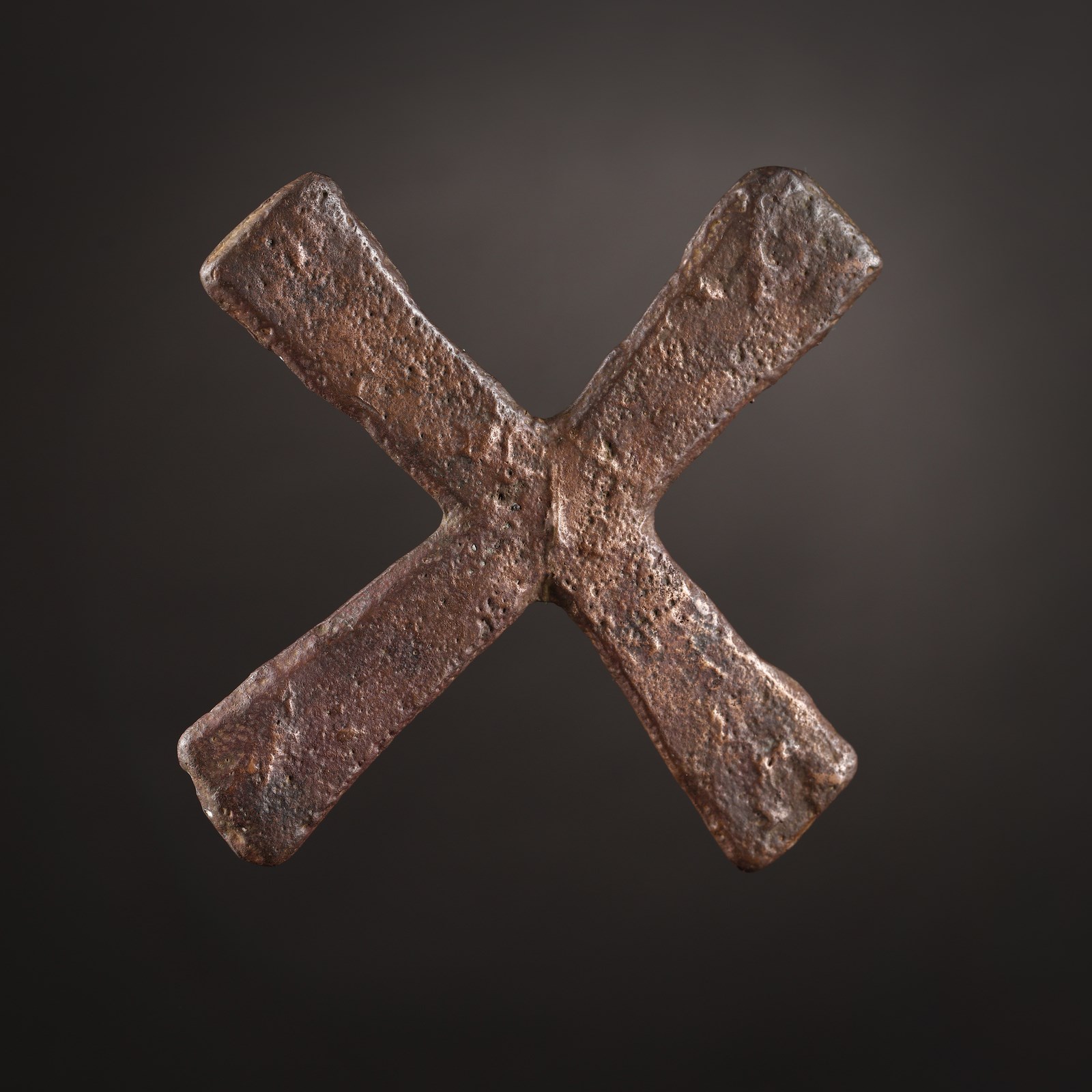 Realizzata in rame puro a forma di X colando il metallo fuso direttamente in uno stampo nella sabbia, questa moneta ha origini antiche: alcuni esemplari sono stati trovati in tombe risalenti al XI secolo. L'abbondanza di rame nella regione del Katanga induce da sempre gli abitanti i della zona ad utilizzare questo metallo nelle trattative commerciali con i vicini.Esemplare in ottimo stato con bella patina.