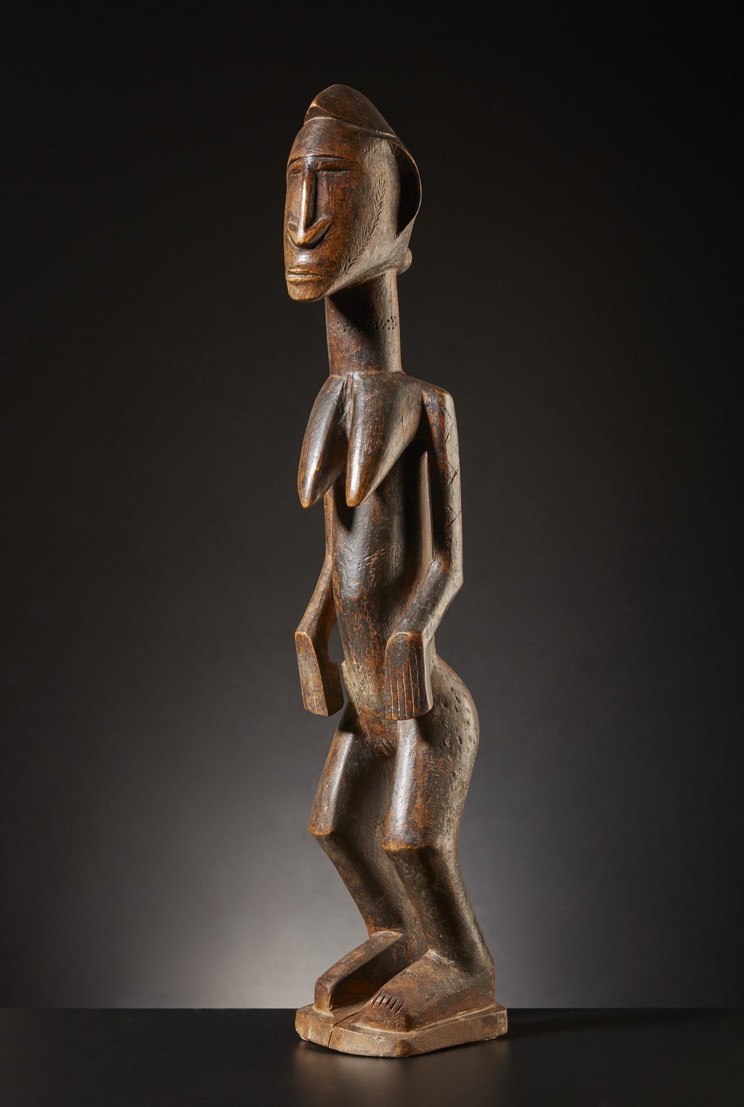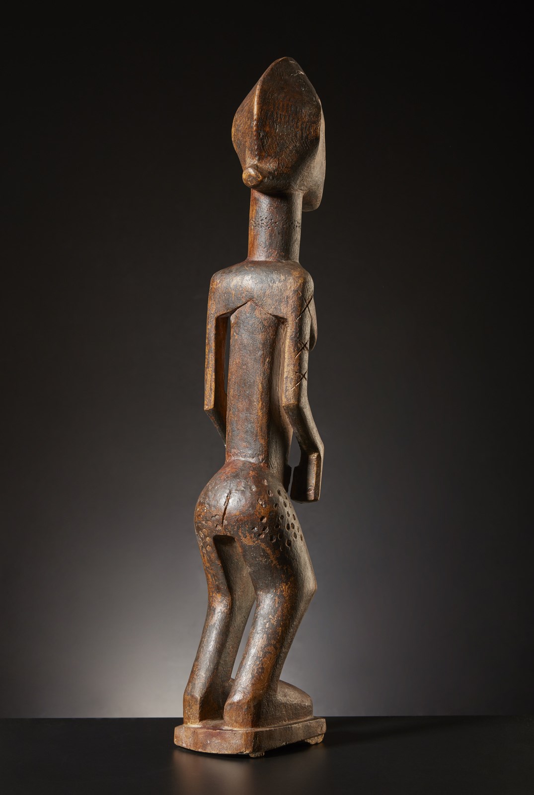Bella per dimensione, qualità dell'intaglio e patina, questa scultura di figura femminile non particolarmente antica, ma rappresentativa dello stile classico dell arte dei Dogon, stupisce per le numerose e variegate tipologie di scarificazioni riportate su di essa. Ne troviamo su viso, collo, seno, braccia, ventre ed infine anche sui glutei. Insomma, a saper leggere, una vera e propria mappa genealogica.Ultima curiosità: per livellare e rendere stabile la scultura, un precedente proprietario dell'opera ha spessorato la base con fette di sughero, come si faceva una volta, quando la plastica era meno diffusa.Da segnalare il distaccamento delle mani dal corpo originariamente unite, dovuto all'essiccamento del legno.