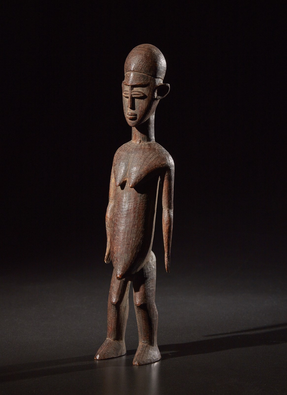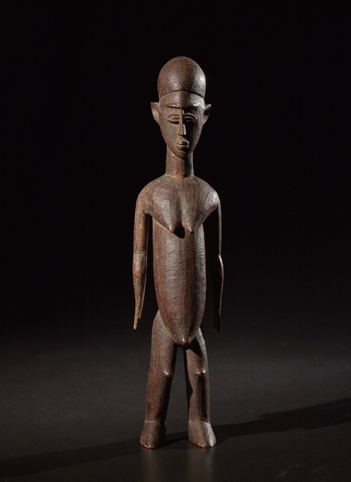 Elegante scultura di figura maschile Lobi nella classica postura eretta, statica e minacciosa, quasi marziale, con lo sguardo attento e pronto, questa Bateba è stata scolpita per rappresentare un antenato o, più probabilmente, per essere messa a guardia dell'altare familiare ed a protezione del suo proprietario da forze, come la strgoneria, che avrebbero potuto danneggiarlo.Patina naturale e segni d'uso.
