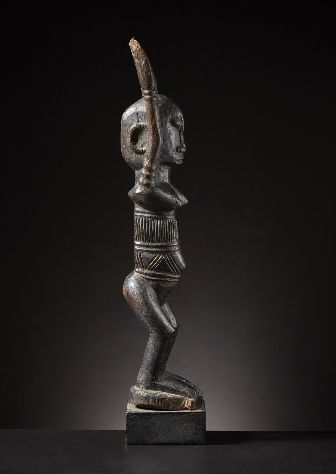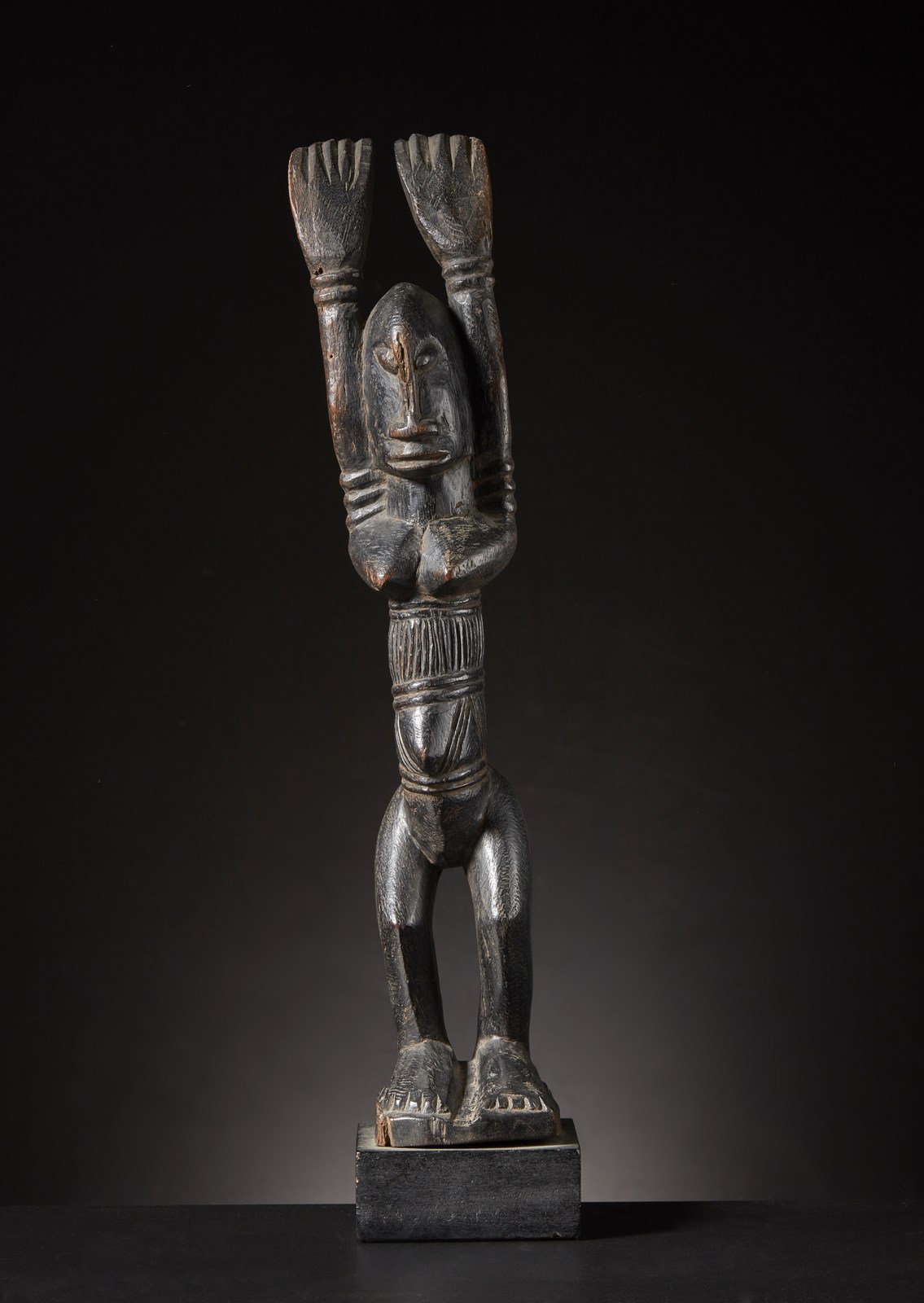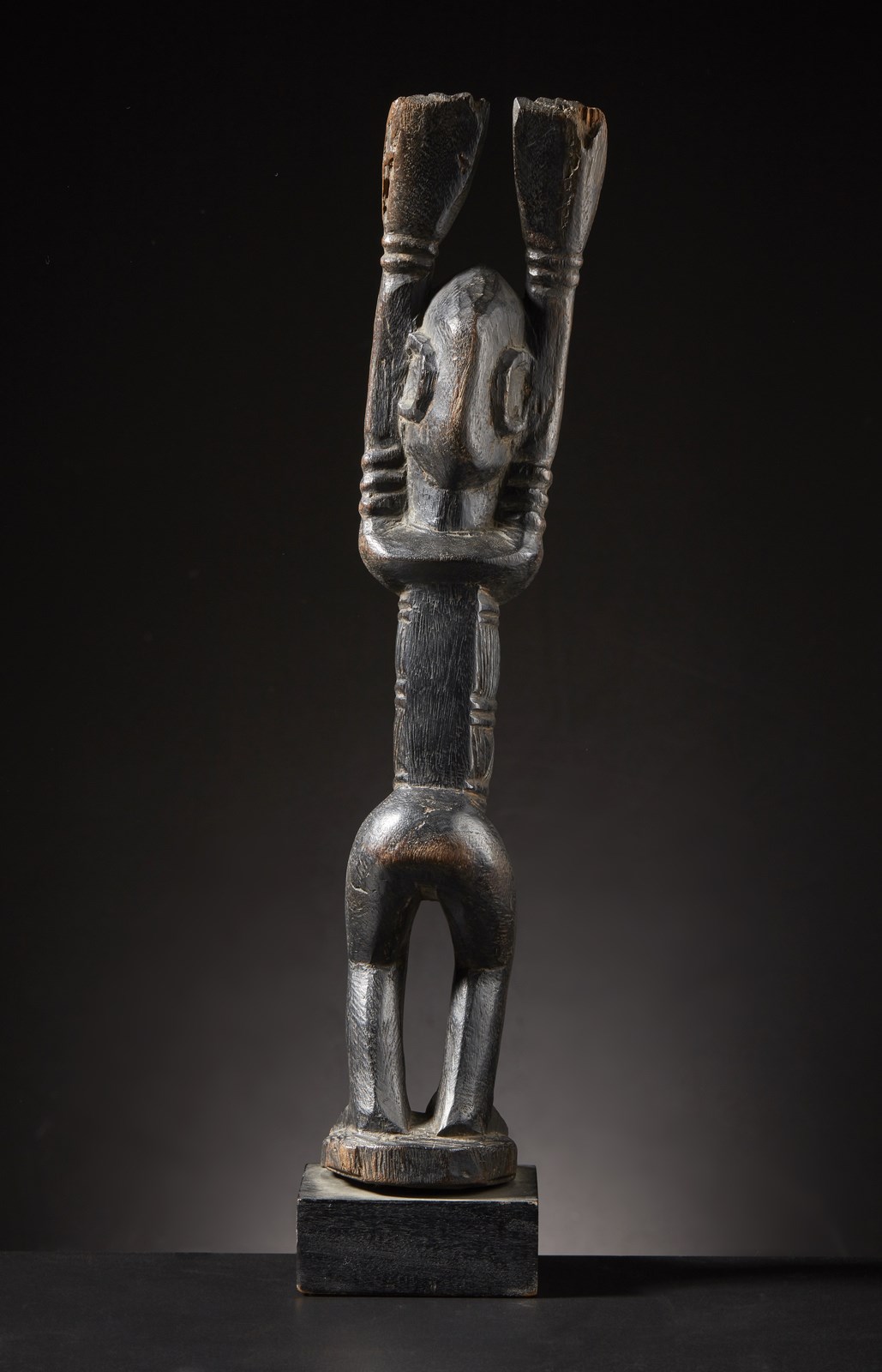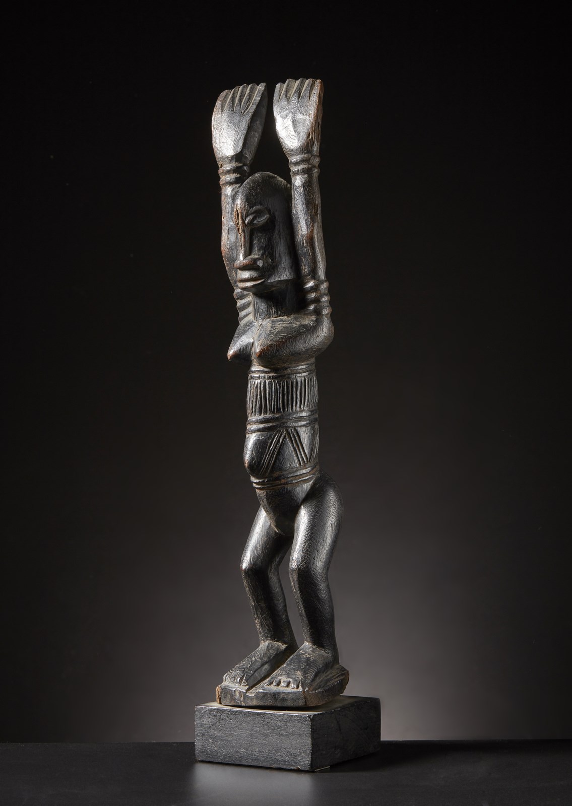 'All'origine dei tempi le donne Dogon staccavano le stelle dal cielo per darle ai loro bambini. Essi le bucavano con un fuso e facevano girare queste trottole di fuoco, per mostrarsi fra loro come funzionava il mondo''. Così raccontava un Ogon, un vecchio capo a Marcel Griaule, antropologo che per primo ha studiato l'enigmatico popolo dei Dogon,Sembra proprio raccogliere stelle questa bella scultura Dogon che ricorda le più anticheTellem. Questo Nommo, (conosciuto anche come spirito primordiale, Maestro dell'Acqua, il Distruttor e o l'Ammonitore) risulta ben scolpito, anche nei particolari di bracciali e scarificazioni addominali, classicamente stilizzato e con una bella patina nera e lucida.Su base