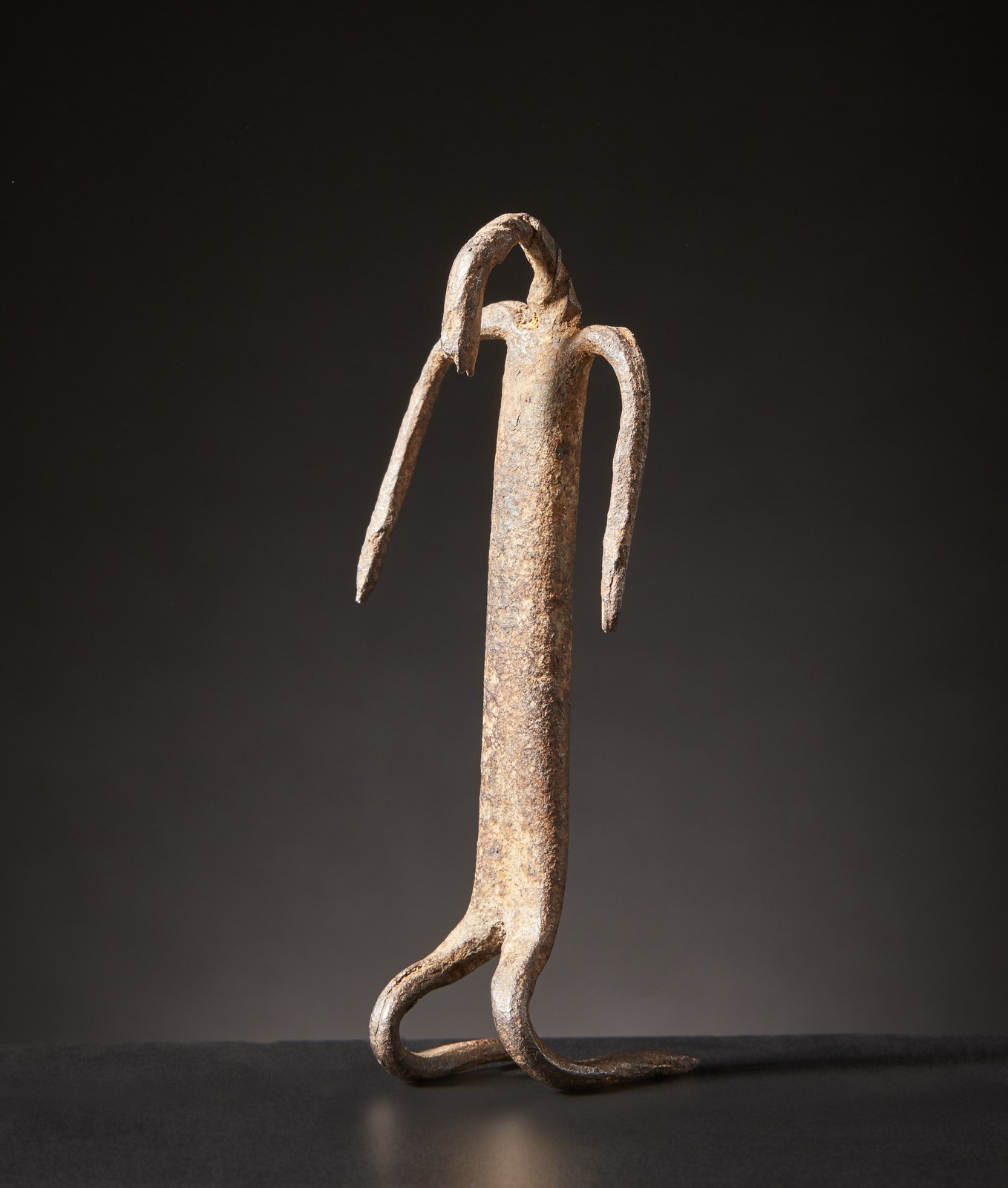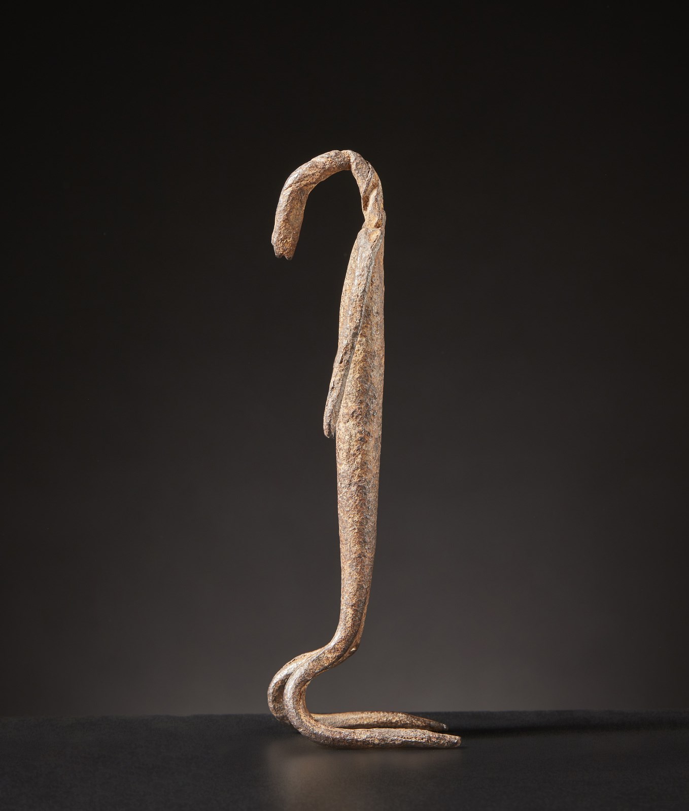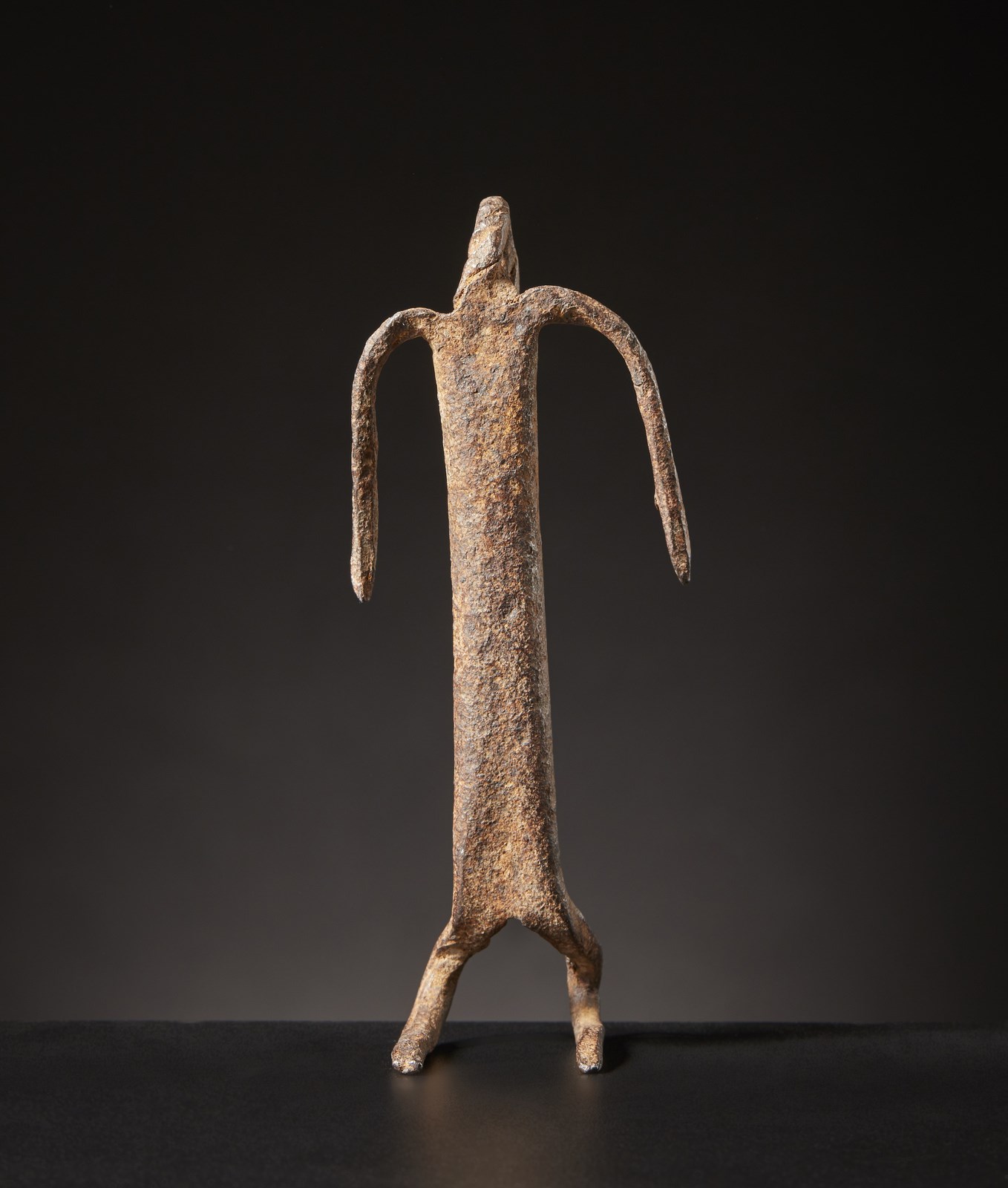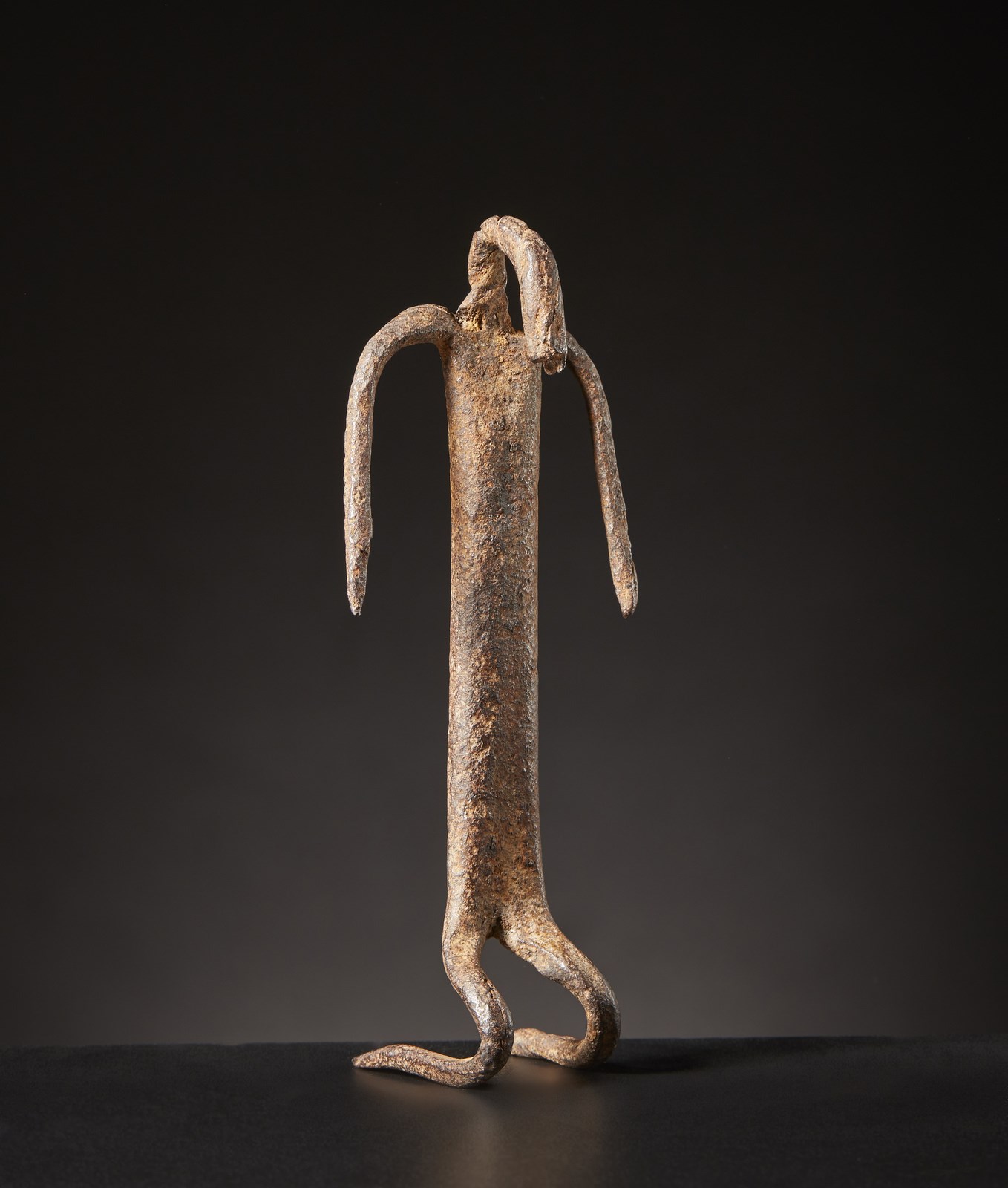 Figura rituale in ferro Dogon, probabilmente Binou gina, in forma antropomorfa con braccia aperte ed inginocchiata.Oggetto di forma plastica esemplare, con gran bella patina.