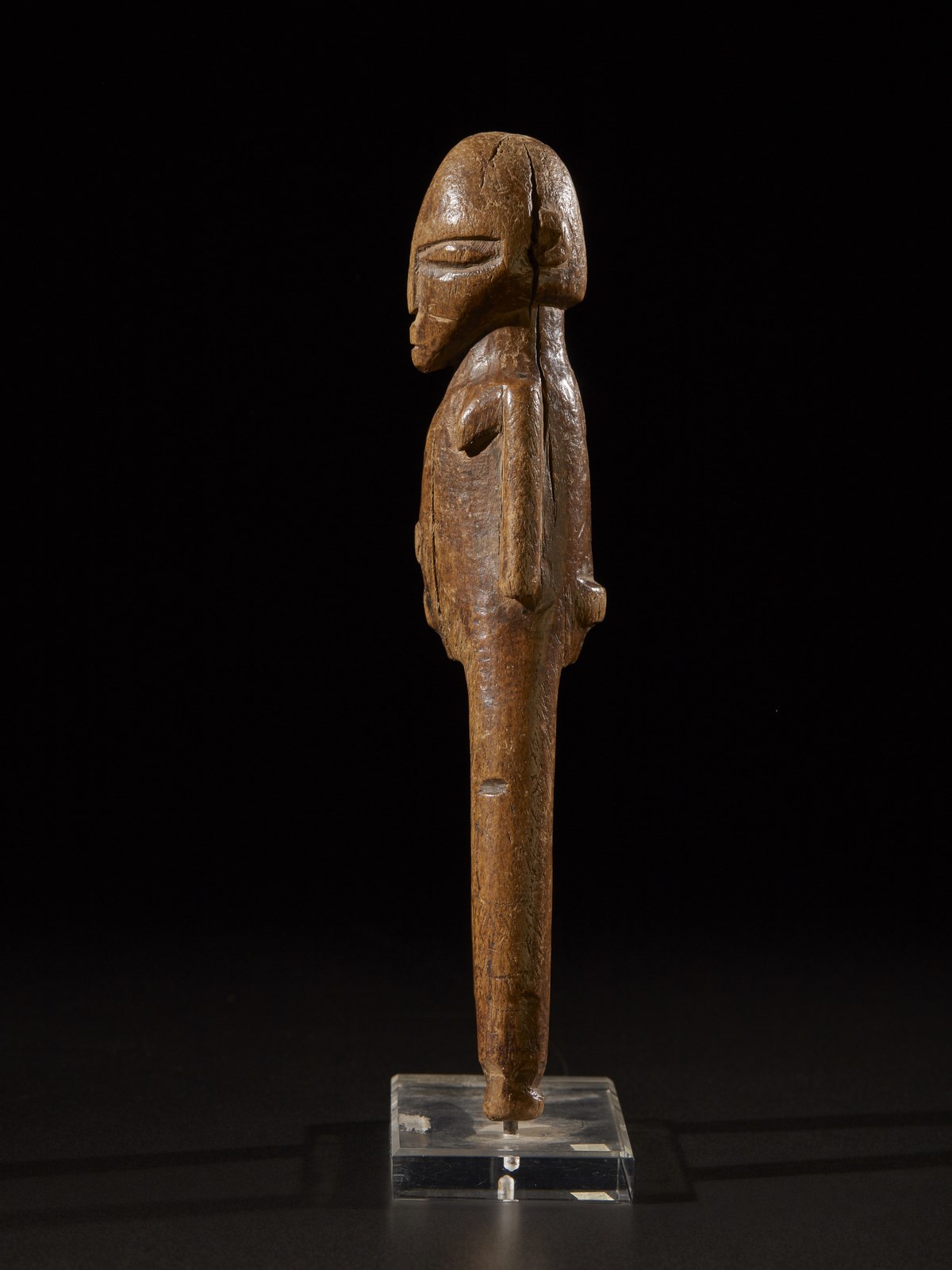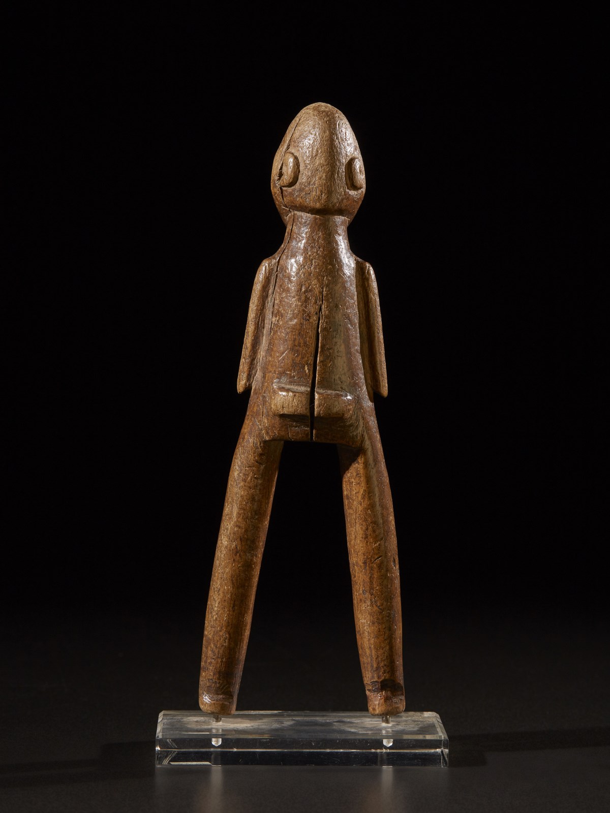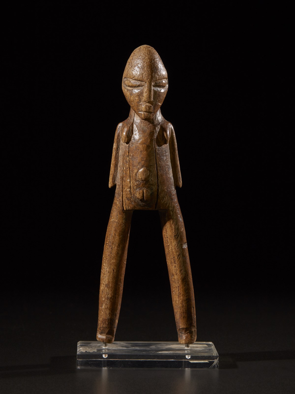 Bella ed antica fionda in legno duro in forma di figura femminile con gambe divaricate e volto corruciato, come da stilemi classici della scultura Lobi.Magnifici segni d'uso ed una base in plexiglass con ogni probabilità risalente agli anni '80 o '90 del secolo scorso.