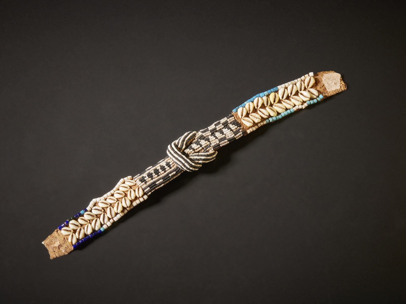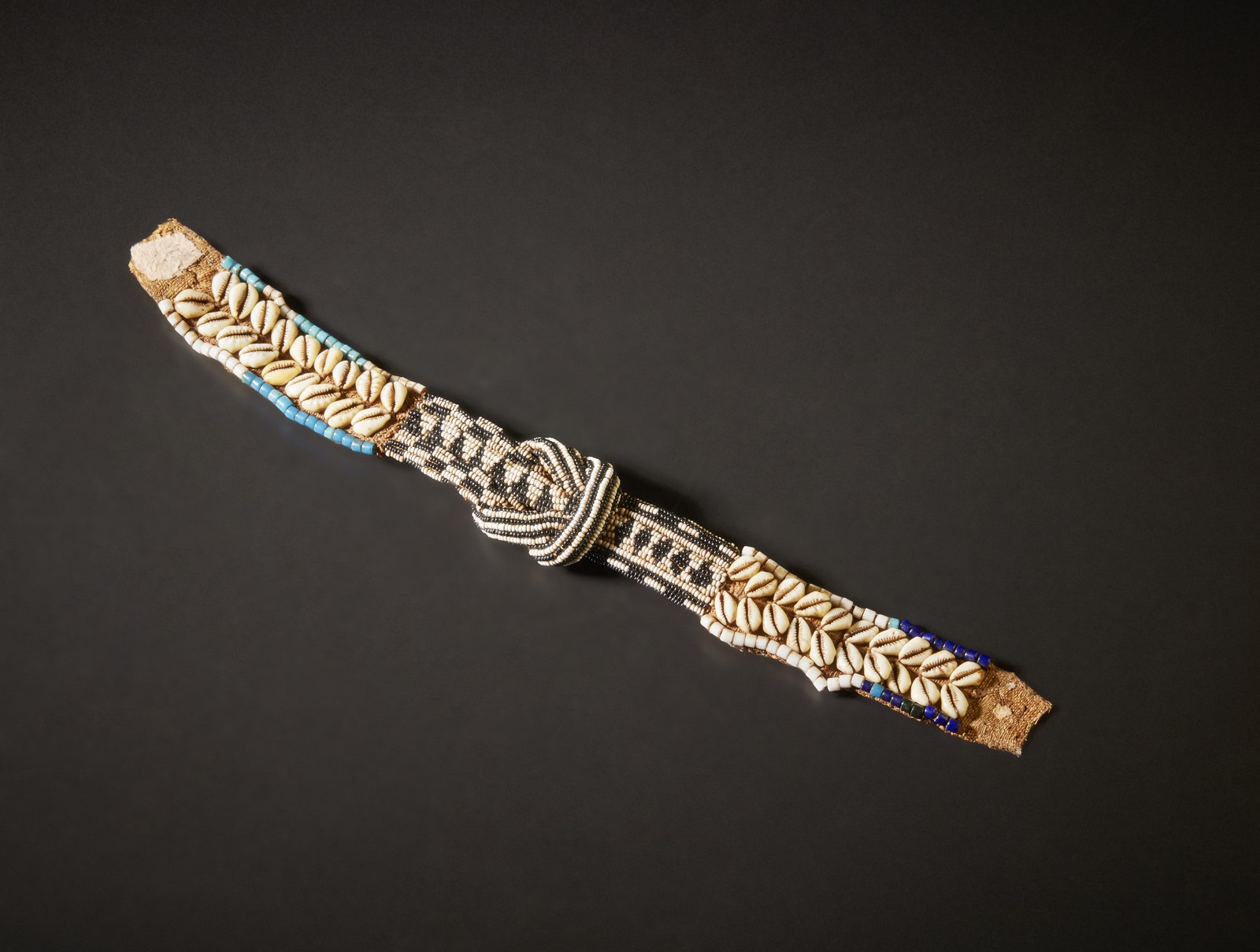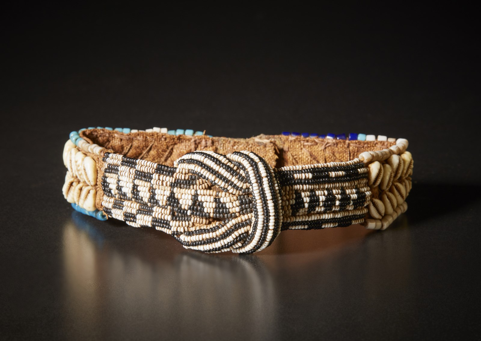 Frammento di cintura.Rafia, perline e conchiglie.Ottimo stato di conservazione.