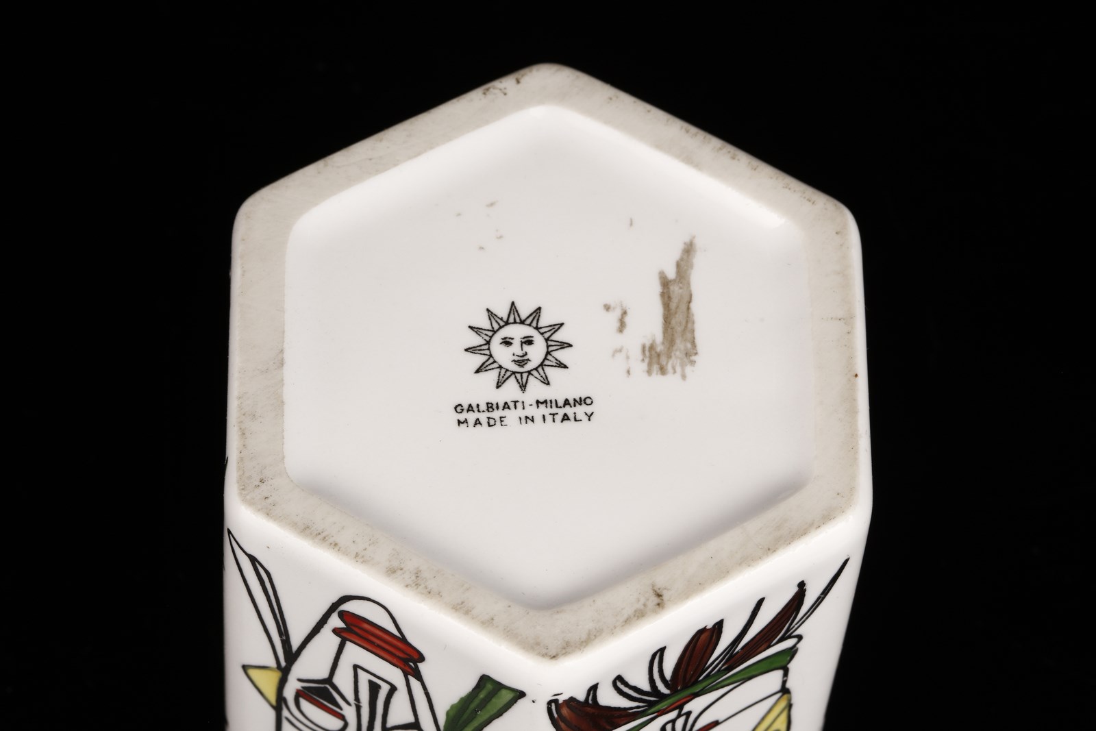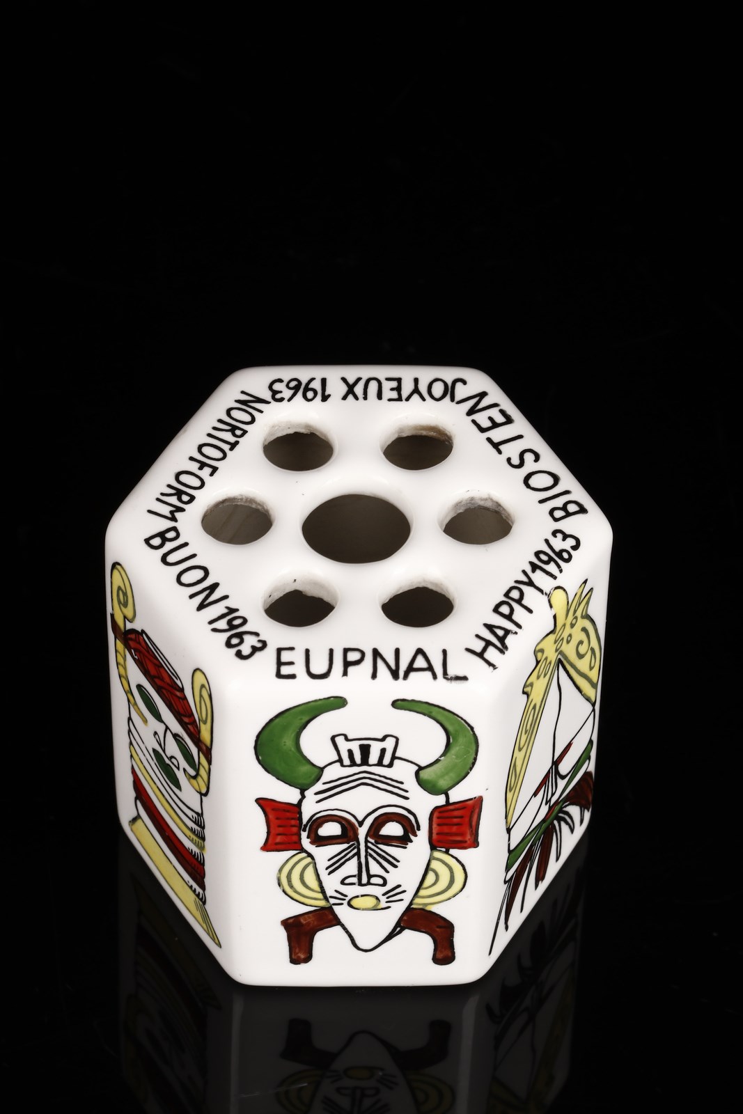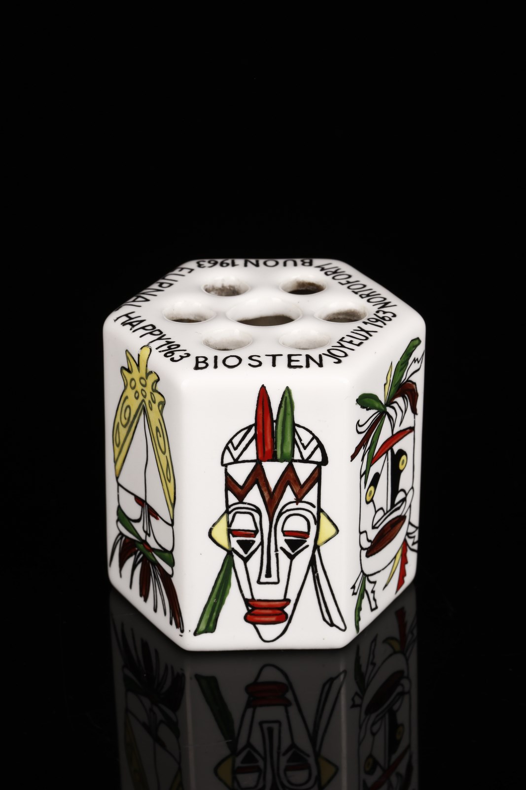 Portapenne e matite in forma esagonale con sette fori, sei decorazioni a colori di sei tipologie di maschere africane e con auguri di buon anno 1963, scritti in sei lingue.Oggetto raro ed accattivante, punto d'icontro tra arte africana e design. In ottime condizioni.