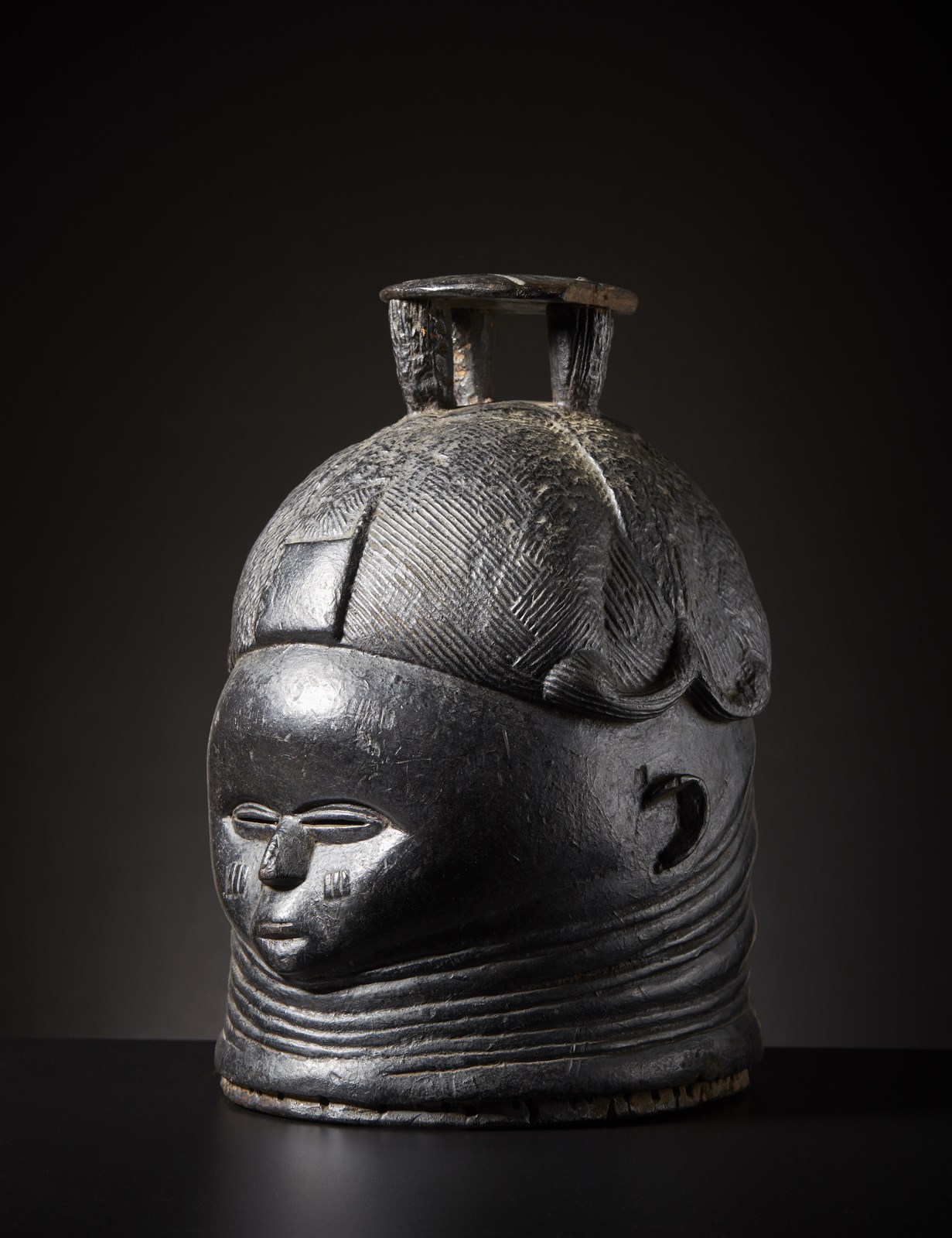 Maschera a casco.Legno duro a patina nera, chiodi.Mancanze, difetti, restauri e [..]