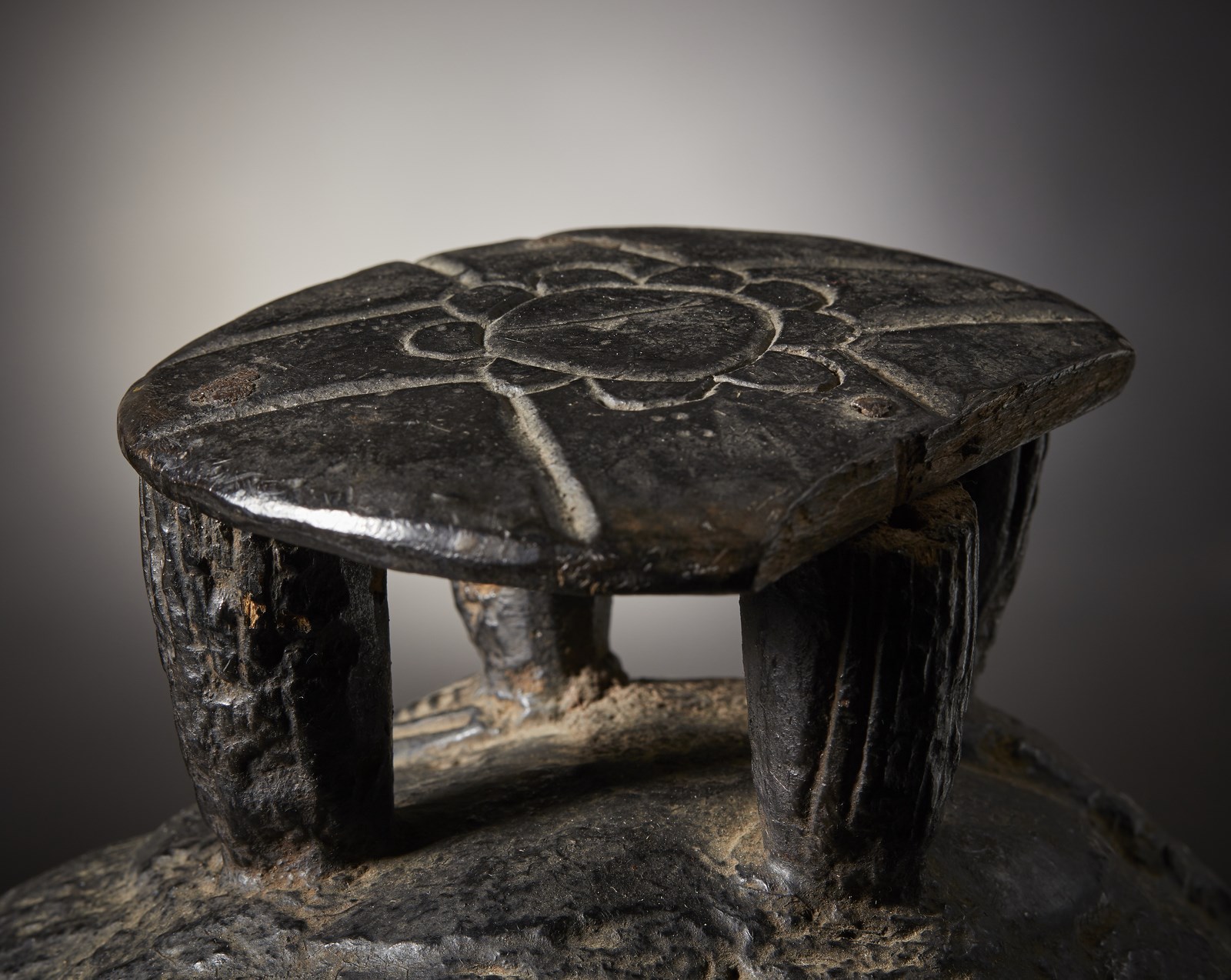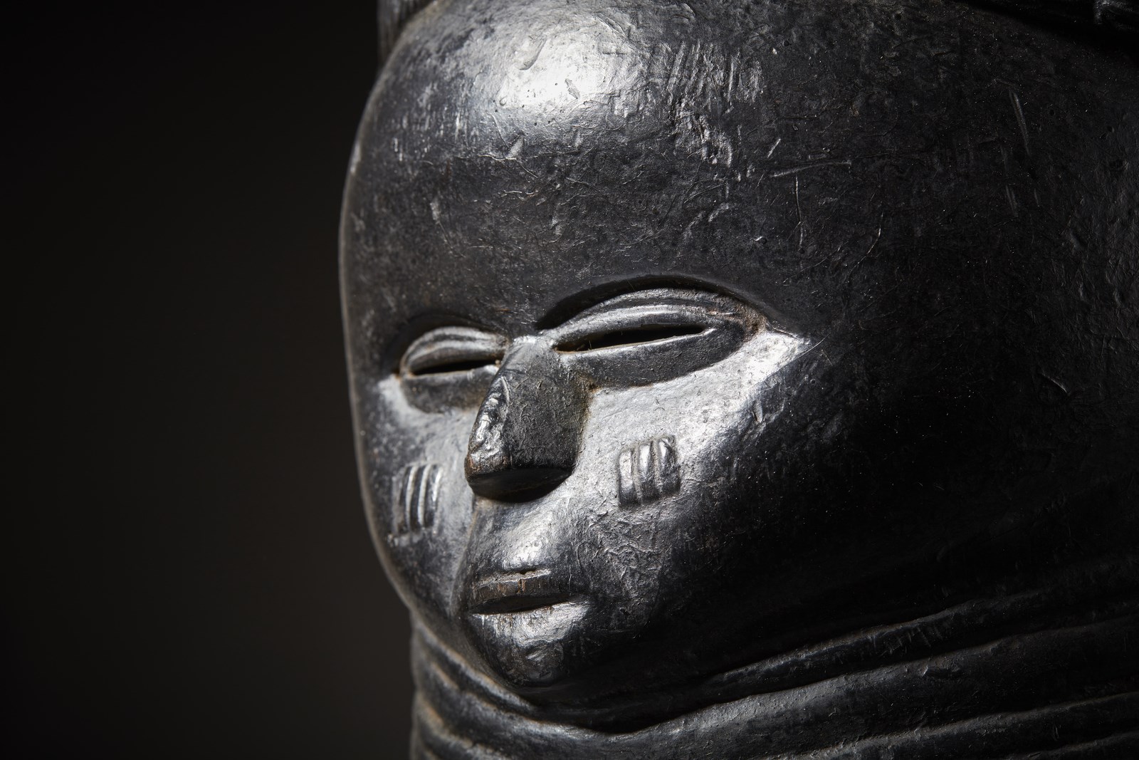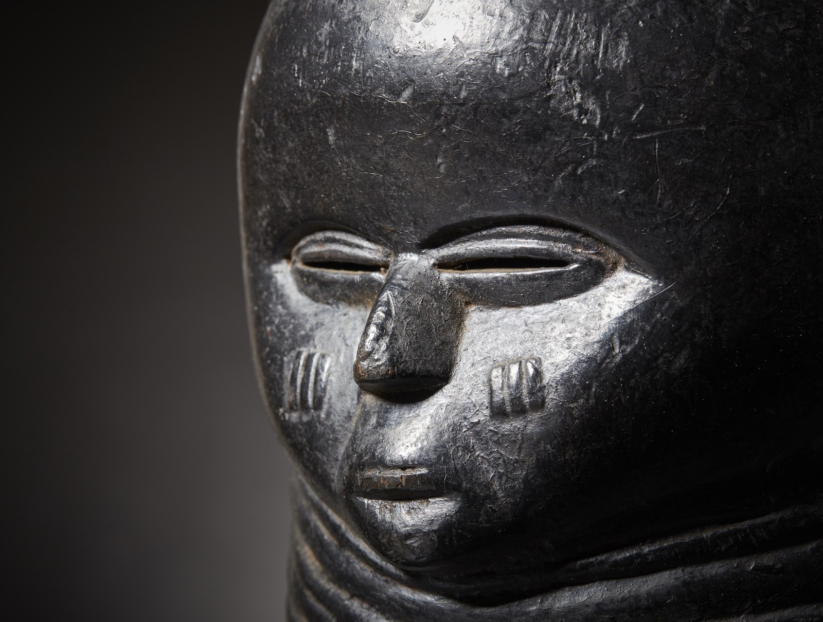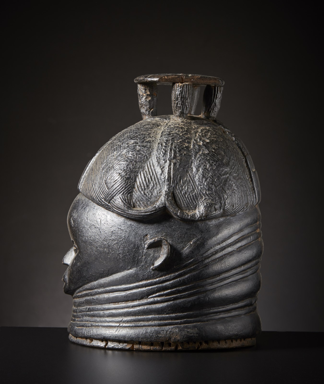 Anticamente le donne anziane dei Mende utilizzavano maschere come questa, durante i riti di passaggio all'etā adulta chiamati Bundu, per spiegare alle bambine il comportamento da tenere circa le varie faccende domestiche che da lė a poco avrebbero interessato le loro vite e famiglie. Spiegavano loro come amministrare il denaro, tenere una casa, rispettare il marito ecc.. Insegnavano alle piccole donne le regole sociali non solo verbalmente, ma anche visivamente tramite quattro tratti estetici comuni a tutte le maschere usate nei riti Bundu: primo, i capelli devono essere sempre ben acconciati, solo le pazze vanno in giro spettinate. Secondo, la fronte ampia denota intelligenza ed apertura mentale. Terzo i rotolini di grasso sul collo rappresentano bellezza, prosperitā, benessere e ricchezza.. Quarto ed ultimo: tenere sempre la bocca chiusa. Questi quattro insegnamenti si ritrovano sempre espressi visivamente in ogni singola maschera dei Mende e dei loro vicini e questa qui riprodotta, esprime questi concetti concretamente in una squisita armonia di elaborate forme e canoni estetici realizzati magistralmente.Utilizzata in molti riti, data la spessa coloritura applicata e rinfrescata ad ogni singola cerimonia, questa splendida maschera era originariamente caratterizzata da un acconciatura ancora pių complessa ed elaborata (da notare su fronte e retro i due gris gisi islamici), ma menomata dal tempo e dall'usura, č stata riparata '' in situ'' con un piattello inciso nella parte sommitale, a sua volta danneggiato.Molte parole possono essere spese per descrivere l'autenticitā ed antichitā di questa maschera, ma nessuna puō riuscire a convincere quanto un dato fisico oggettivo. Questa maschera in legno duro e con quattro chiodi utilizzati per il restauro, pesa oggi solo 610 grammi.In allegato presentiamo una fotografia realizzata da Tiziano Ortolani a Reims, Francia e commissionata da Rene Druart per essere utilizzata nel progetto di catalogazione della propria collezione di arte africana.