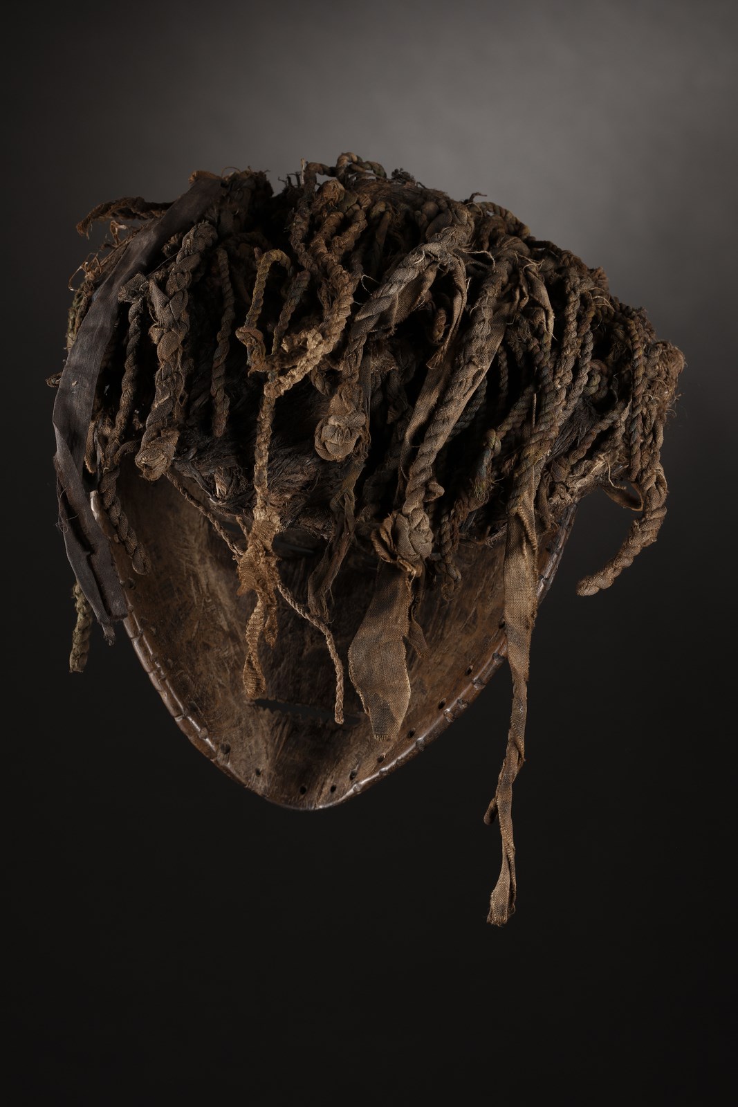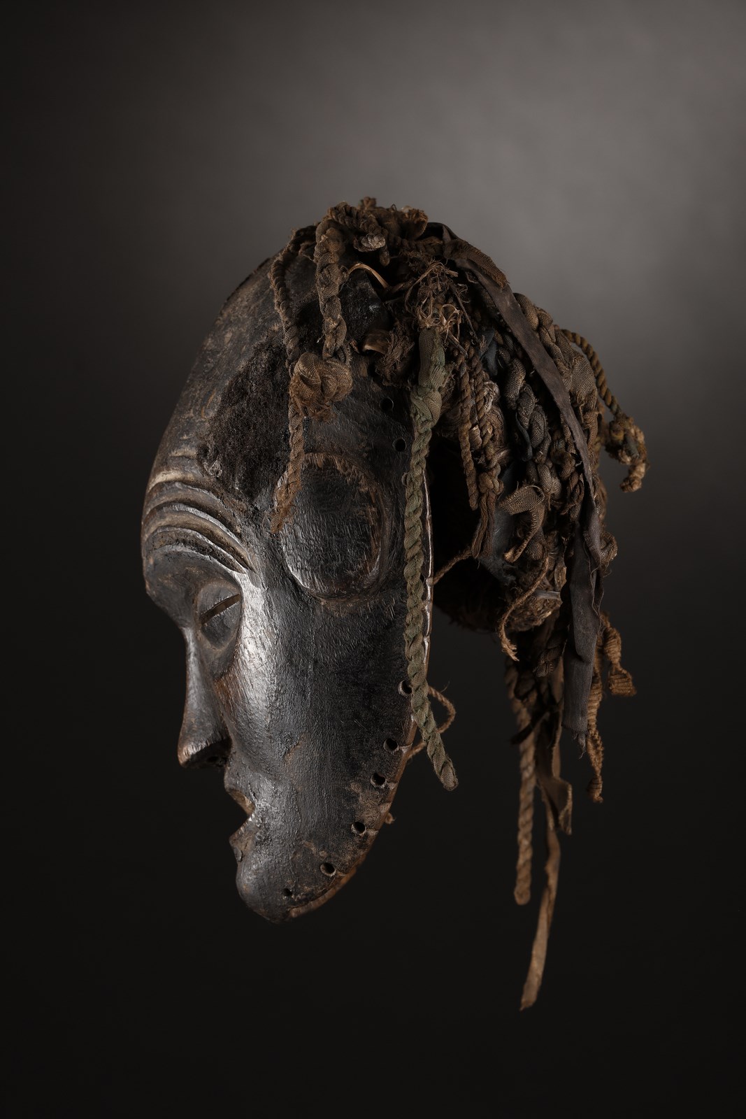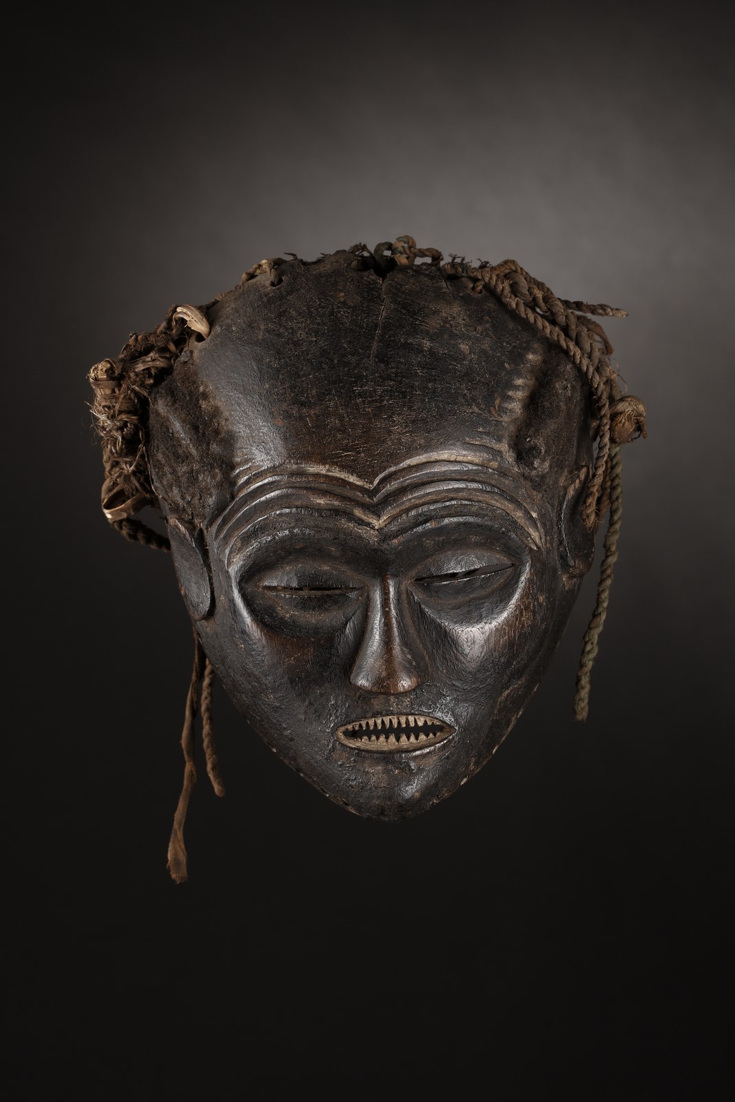 In quasi tutti i gruppi Chokwe che popolano il vasto territorio che si estende tra Angola e Zaire, le maschere Chihongo rappresentavano lo spirito di una persona defunta che intercedeva per aumentare prosperità e potere maschile. Formalmente questa tipologia di maschera era ritenuta complementare alle maschere Pwo che notoriamente incarnavano i tratti femminili di bellezza. Acuni gruppi Chokwe ritenevano che questa maschera enfatizzasse le caratteristiche reali e potesse essere utilizzata e posseduta solo dal re e dai suoi figli.Splendida per espressività, usura e stato di conservazione, questa maschera è caratterizzata da due fasce di capelli umani applicate solo sopra le orecchie e da tre ordini di incisioni sopraccigliari che suggeriscono un'influenza stilistica Mbunda.Integro tutto il sistema di rami, fibre e tessuto che compongono la parte posteriore di questa maschera e che permetteva al danzatore di indossarla come cappello.Bella la patina scura e vissuta ed i suoi molteplici segni d'uso.