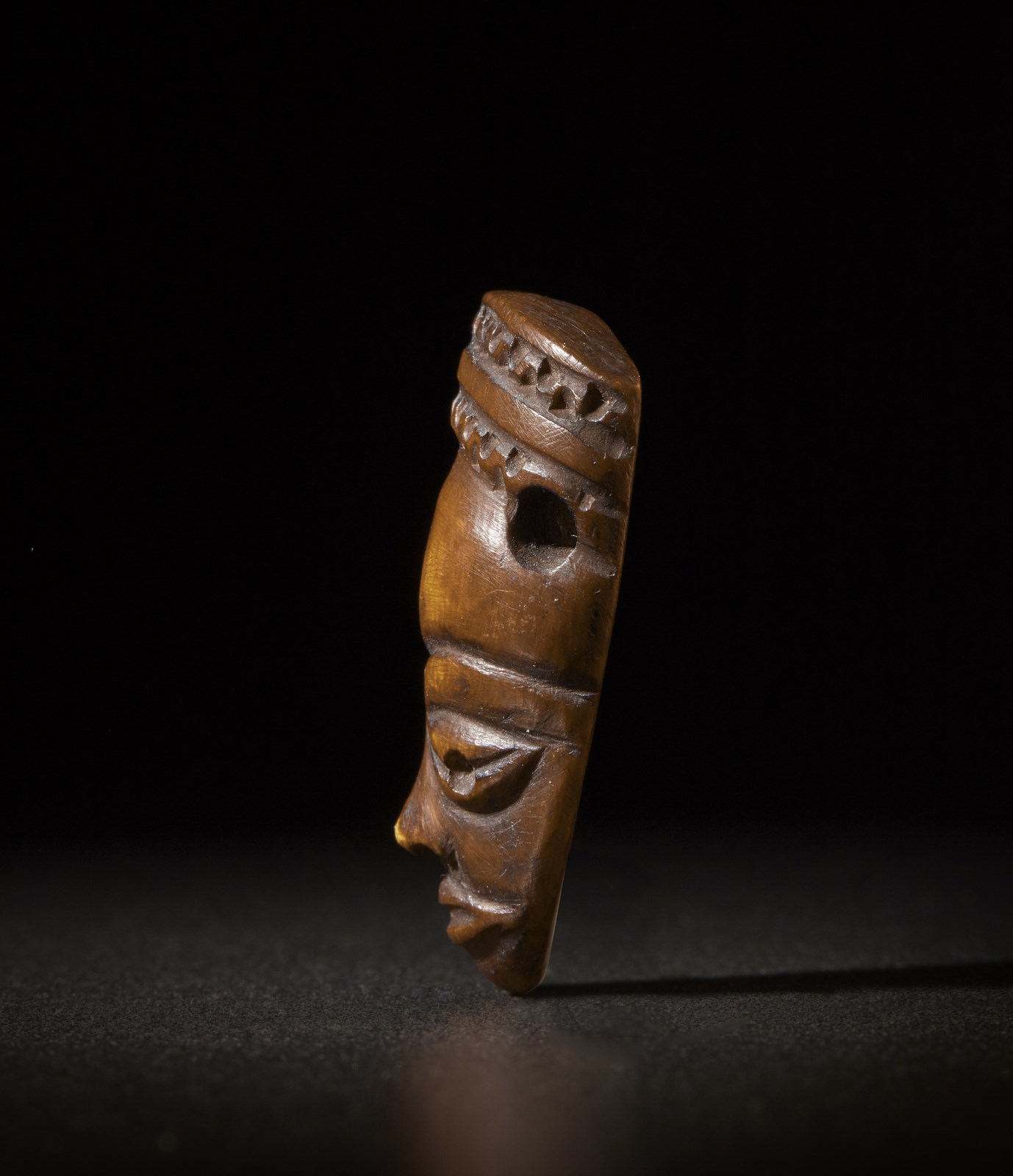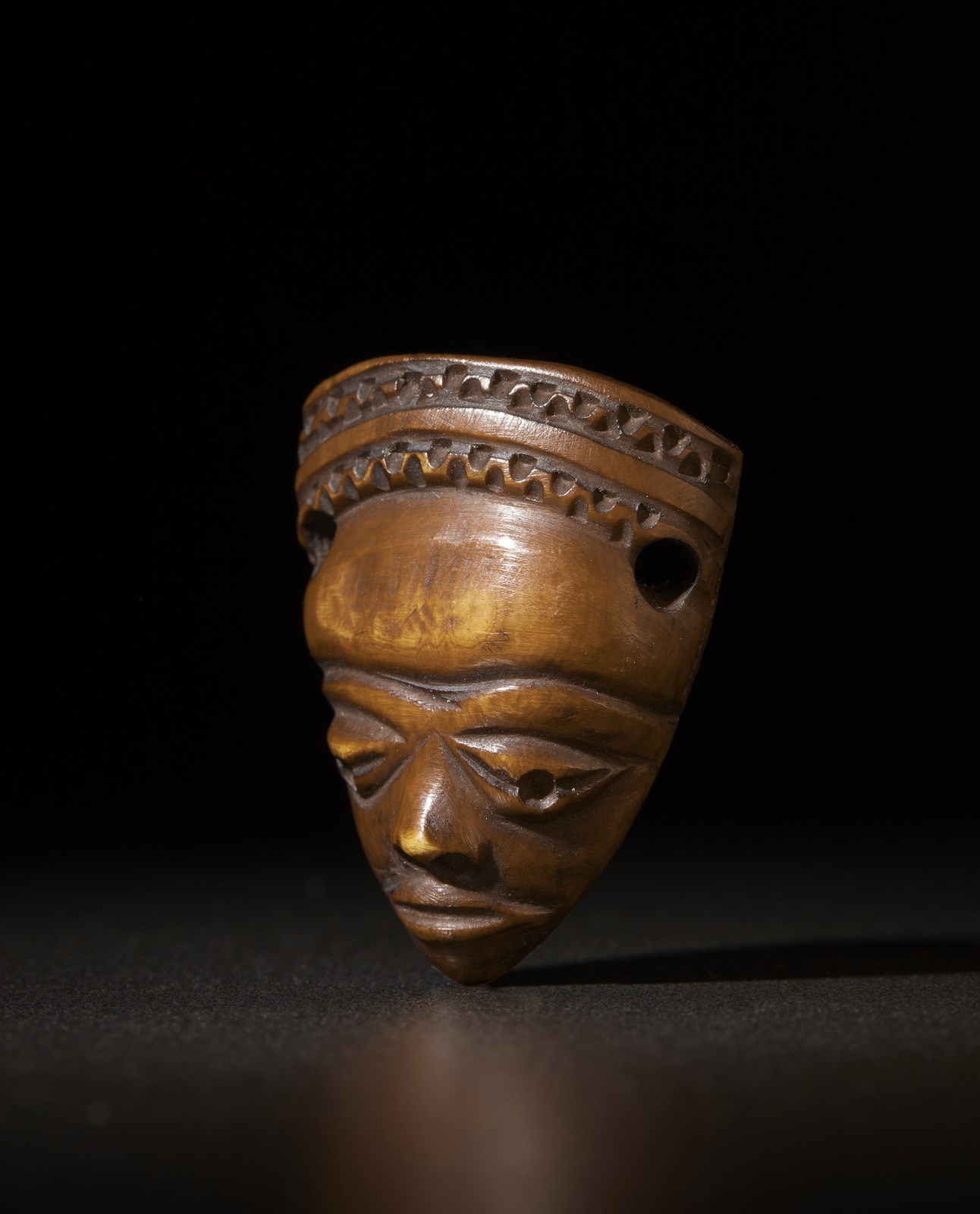 Deliziosa piccola maschera in avorio a patina bruna.I due fori laterali sulle tempie e sotto il cappellino sono corredati da un invito inciso per contenere la fibra intrecciata. Portata al collo con devozione, rappresentava uno di quegli oggetti, riti, iniziazioni e culti tramandati al clan dagli antenati.Un concentrato iconico di tutta la scultura dei Pende del Congo.Peso: 10 grammi Opera corredata da certificato CITES.
