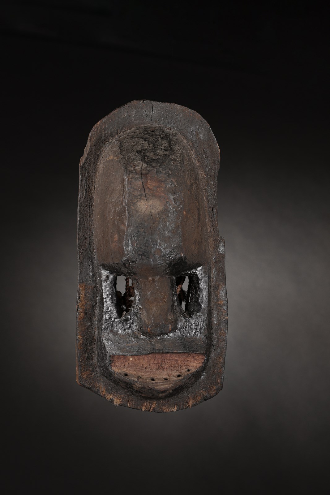 Bella e potente maschera di scimmia nera Dogon, caratterizzata da viso e naso allungato, fronte bombata , occhi triangolari e bocca larga ed aperta colorata di rosso. Al suo interno visibili i fori che contenevano i denti oggi mancanti.Con peli animali intorno al perimetro basso del volto e dipinta con pigmenti naturali e bitume che ne esaltano l'espessività, questa maschera Dogon merita un posto privilegiato all'interno del pantheon della scultura primaria africana.