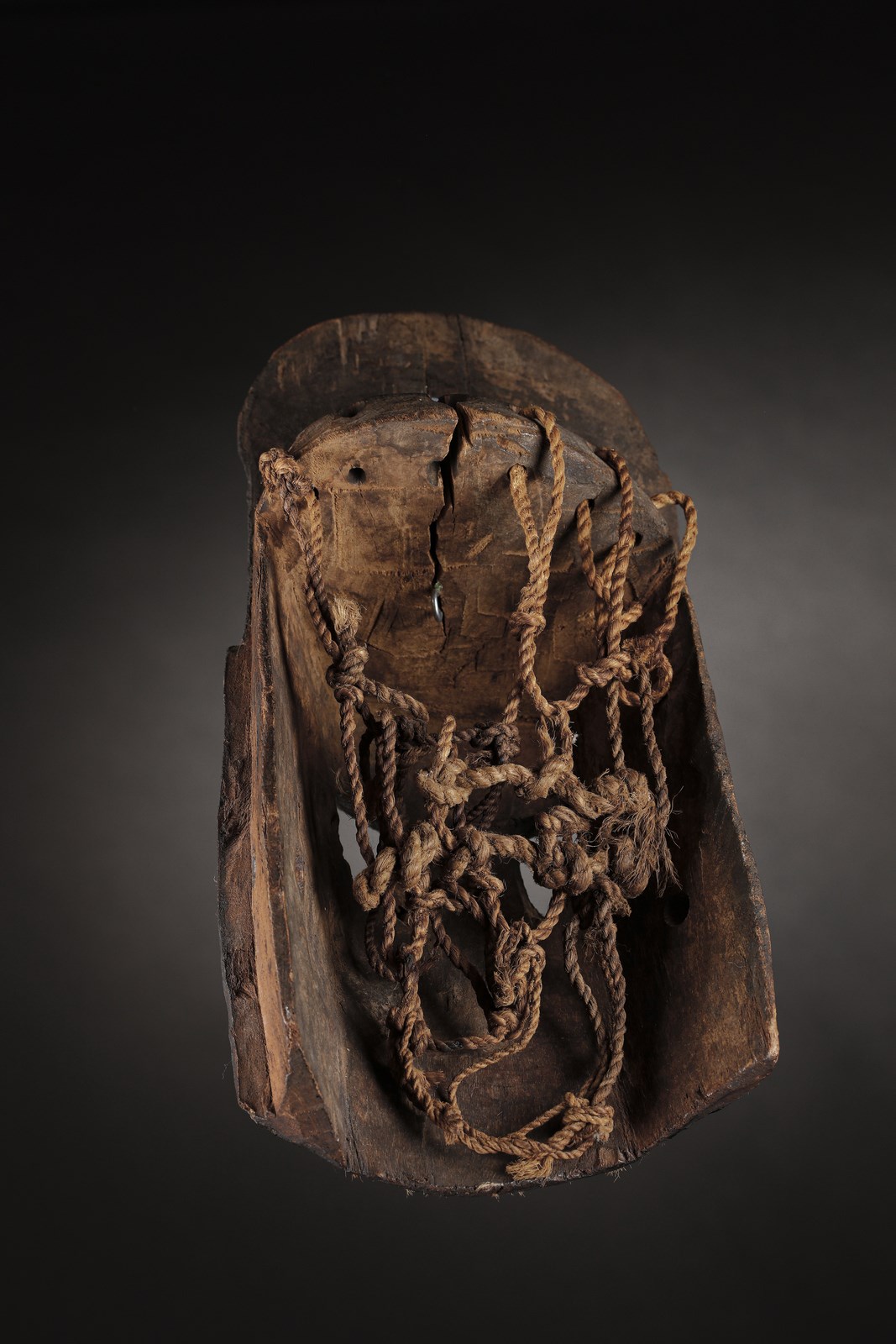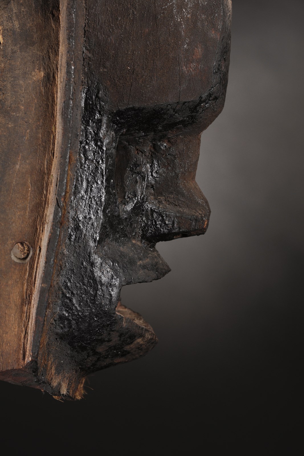 Maschera di scimmia nera.Legno duro a patina scura, bitume e pigmenti, peli animali [..]