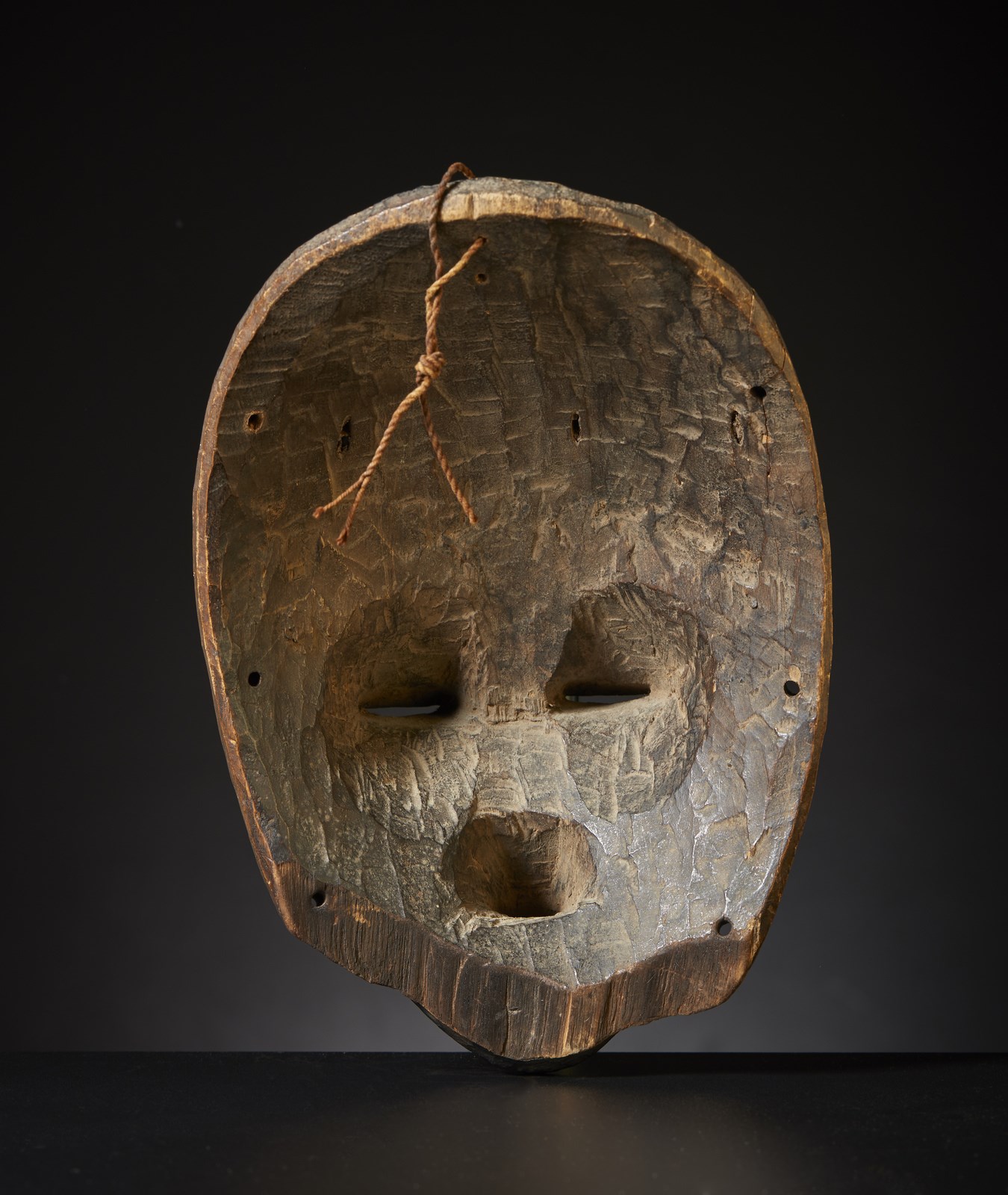 Maschera antropomorfa maschile Guro rara e di grande forza espressiva.Magnificamente intagliata per rapporti volumetrici e cura di particolari, con una notevole patina ed eccezionali segni d'uso, questa maschera Gugu nasceva con ogni probabilità con una scultura umana o di volatile che sovrastava la parte sommitale della testa, come ci rivelano le numerose mancanze riscontrabili nell'elaborata acconciatura.Nonostante le mancanze ed i difetti resta comunque un'eccezionale testimonianza dell'altissima qualità espressiva raggiunta da questo anonimo scultore Guro dell'Africa sub sahariana ed al contempo, un divertente richiamo visivo alla fortunata serie di cartoons ''I Simpson''.