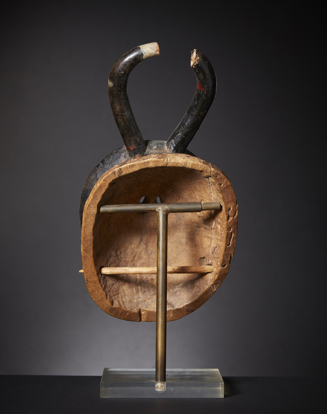 Le maschere Kpliè Kpliè erano utilizzate durante i riti N'guli, durante le feste per la semina ed il raccolto e per i funerali di personaggi importanti, in rappresentanza dello spirito degli avi defunti.Quanto di più astratto e sintetico l'arte africana sia riuscita a produrre, queste maschere composte da un disco piatto con bocca rettangolare, due occhi a goccia solitamente perforati per permettere la visione al danzatore e sormontate da due corna che richiamano il bufalo, venivano prodotte in diverse grandezze ed alcune potevano raggiungere ragguardevoli dimensioni.Nel nostro caso questa bella maschera Kpeliè Kpeliè è di dimensioni medio piccole, usata spesso e ridipinta più volte, ultima delle quali con vernici industriali, prima di partecipare ai riti nguli, è stata probabilmente restaurata '' in situ'' nella parte sommitale del corno destro, ove è presente anche un chiodo e sicuramente restaurata in occidente in maniera ''casalinga'' dato l'abbondante utilizzo di colle viniliche nella cornice sottostante al volto.Da notare la presenza del ramo posizionato trasversalmente tra due fori al retro con cui il danzatore teneva la maschera mordendola.La base moderna in plexiglass ed ottone è stata realizzata con ogni probabilità negli anni a cavallo tra gli '80 e '90 del secolo scorso.