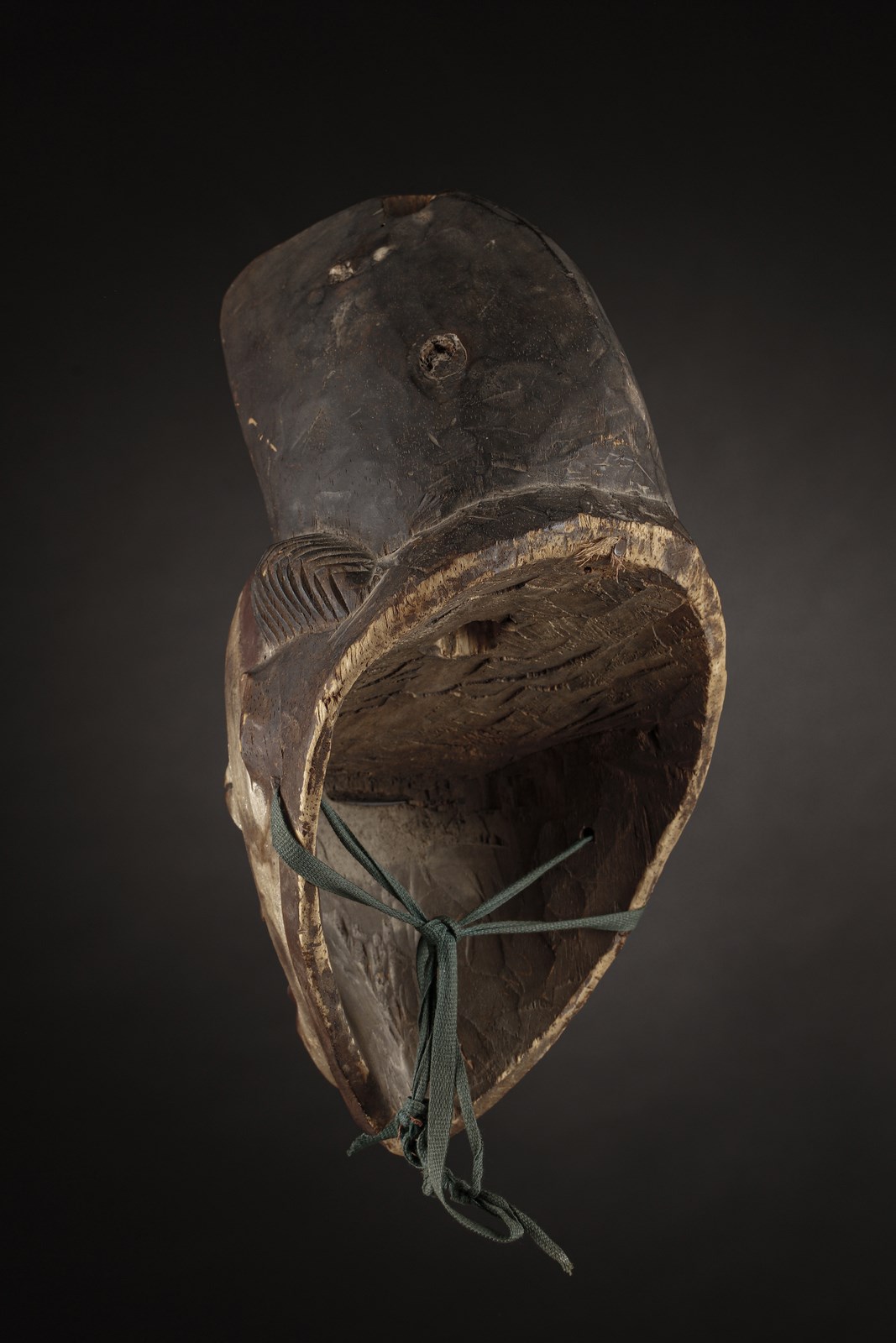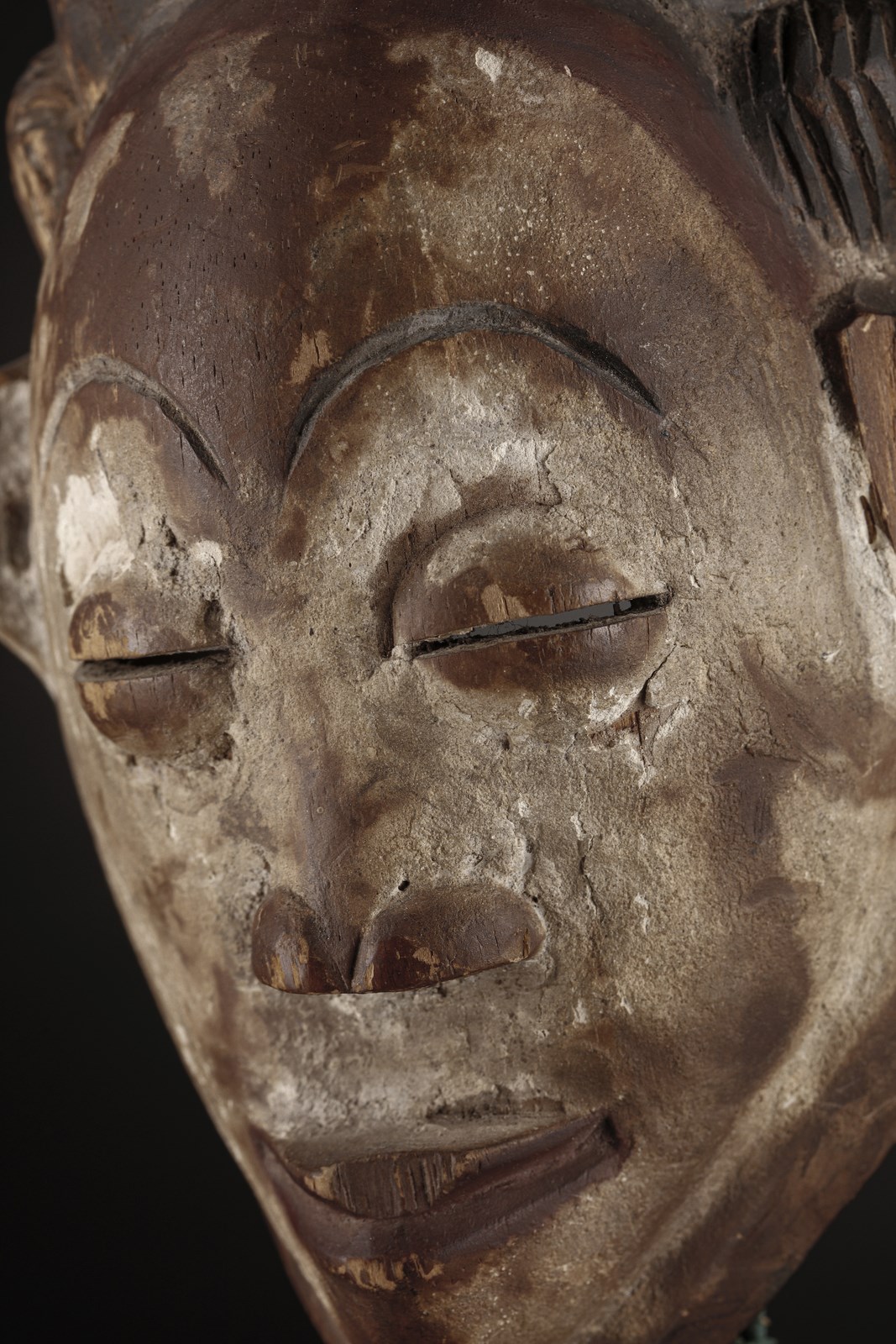 Le maschere Mukudj dei Punu, belle e molto richieste dal mercato collezionistico, fanno pensare a maschere orientali per l'espressione degli occhi a fessura leggermente obliqui e per il pallore dato dal caolino con cui erano originariamente ricoperte. In realtŕ sono maschere funerarie rappresentanti il volto di una giovane donna defunta e venivano usate in tutte le cerimonie funebri da danzatori su trampoli che compivano spettacolari evoluzioni minacciando gli astanti con versi e con scacciamosche per incutere maggiore soggezione. Esse avevano anche funzione di figure reliquario, come presso i Fang.Di bella fattura e raffinata levigatura, splendida per la silhouette del profilo, questa vecchia maschera ha purtroppo subito molto dal tempo e ne porta traccia con le sue mancanze, al labbro ed orecchio. Sotto l'abbondante caolino ancora presente č visibile una densa coloritura rosso-brunastra, forse retaggio dell'utilizzo di questa maschera anche per funzioni di ordine pubblico.